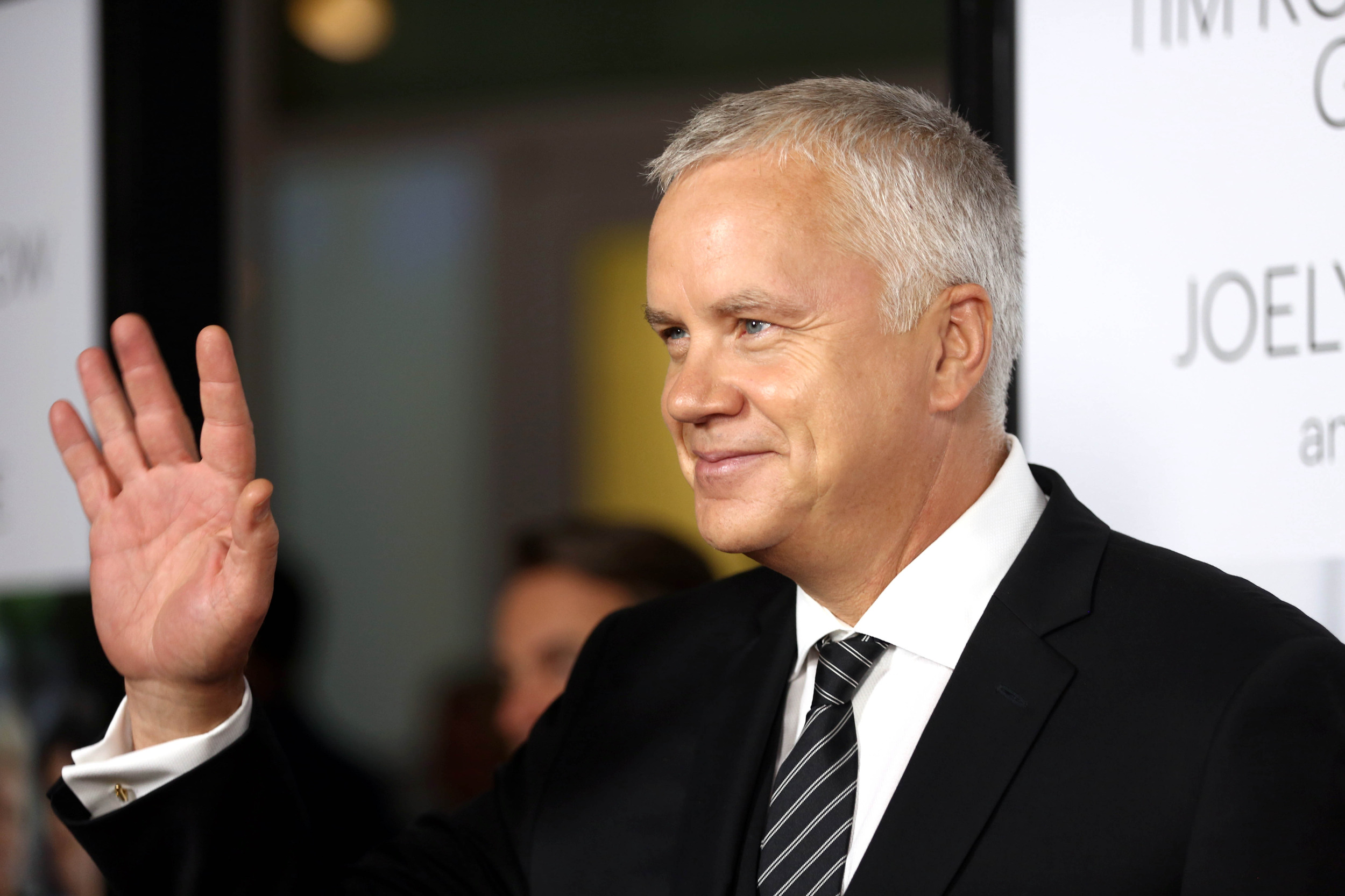 Description: A man in a suit waves to the crowd at a film festival in new york city.