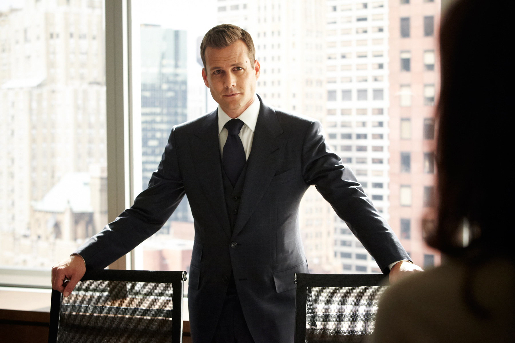Description: A man in a suit standing in front of a window with his arms outstretched out and his hands on his hips.
