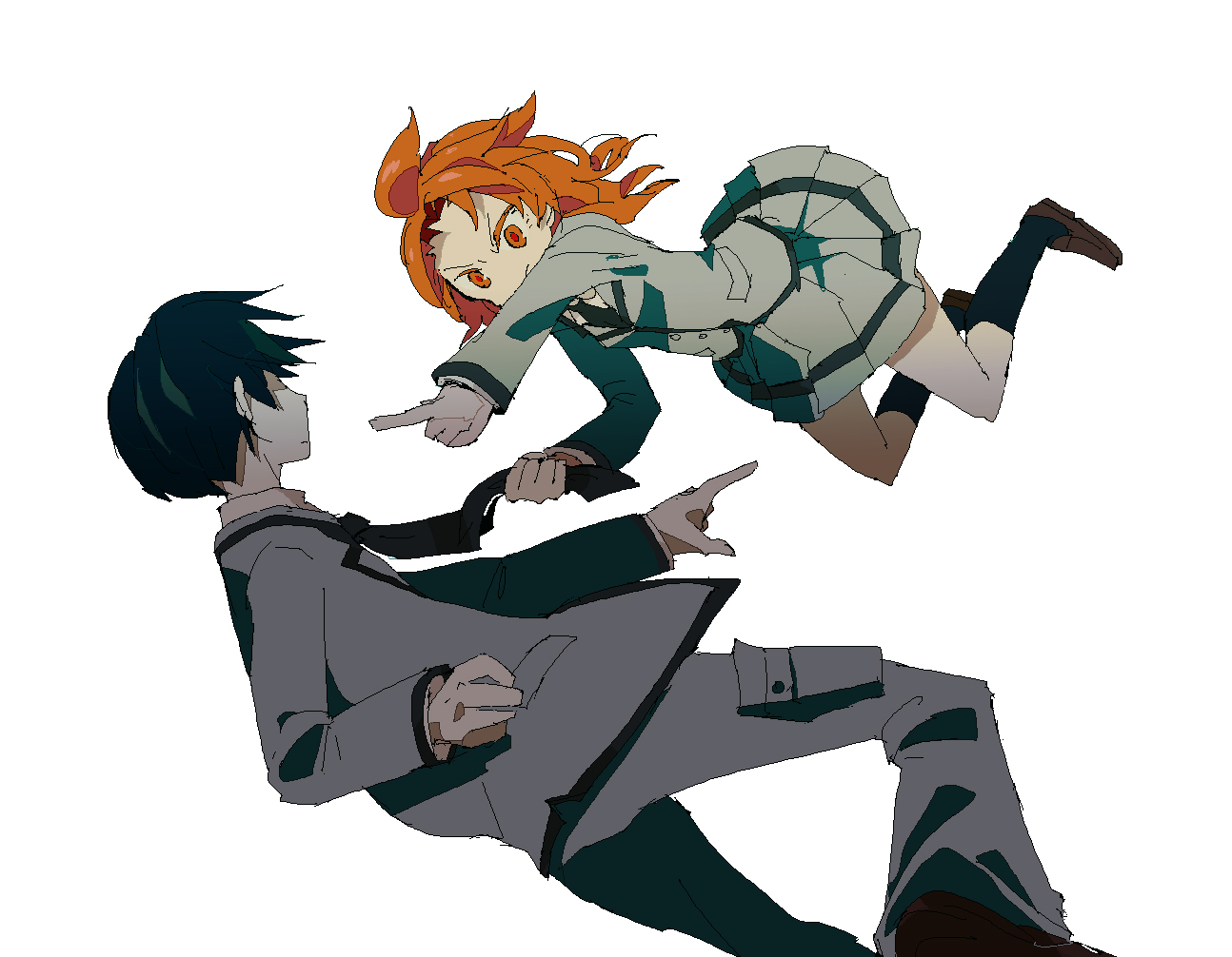 Description: A man in a suit and a woman in a suit are flying through the air with their hands together.