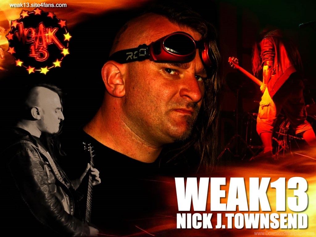 Description: A man with sunglasses on his face and a band in the background with a neon background and a photo of a man with a guitar.