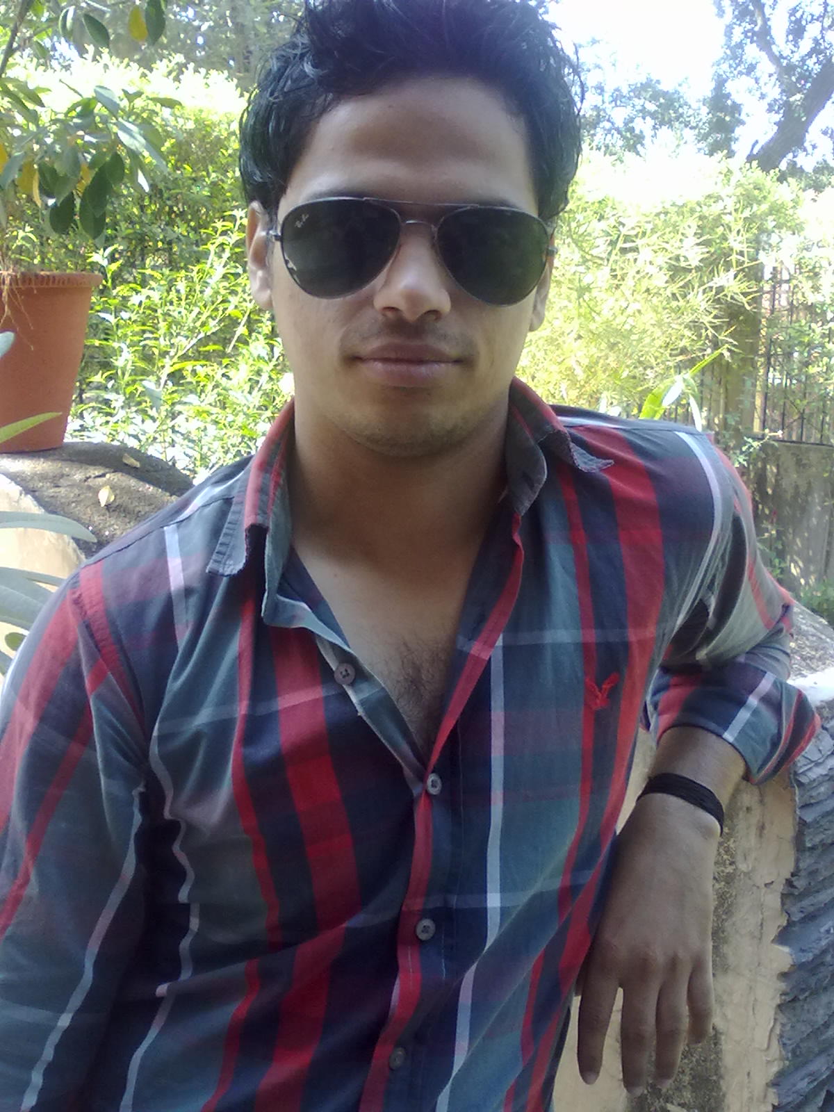 Description: A man wearing sunglasses sitting on a bench in a park area with a tree in the background and a potted plant in the foreground.
