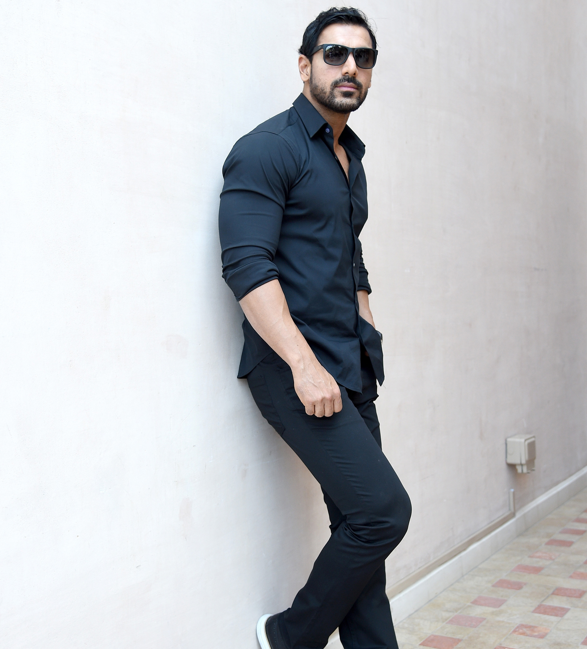 Description: A man leaning against a wall wearing sunglasses and a black shirt and black pants with a black shirt and white shoes.