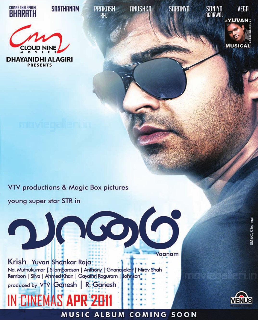 Description: A poster of a man with sunglasses on his face and a city in the background with buildings and clouds.