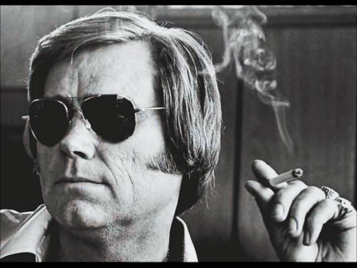 Description: A man with sunglasses smoking a cigarette in a black and white photo with a cigarette in his hand and a cigarette in his other hand.