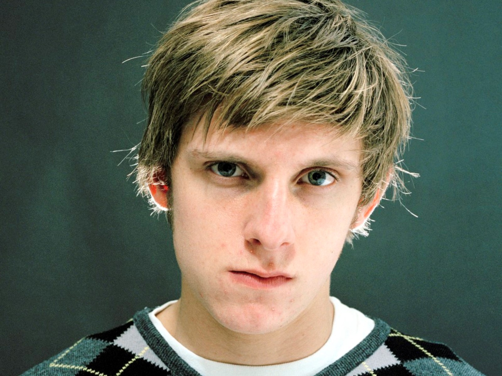 Description: A man with a sweater on and a green background with a black background and a white shirt with a black and white checkered pattern.