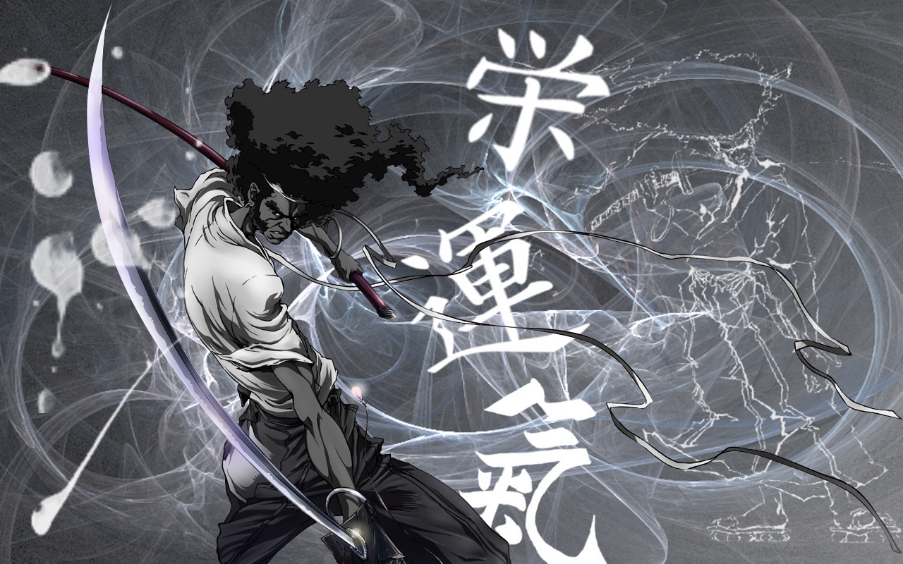 Description: A man with a sword in his hand and a background with asian characters in the background and a circular design.