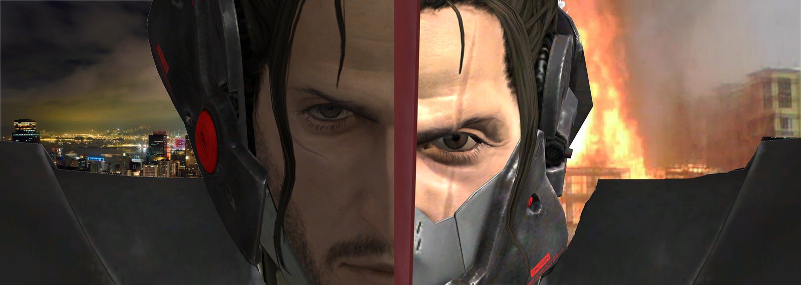 Description: A man with a sword in front of a city skyline with a fire in the background and a city skyline with a fire.