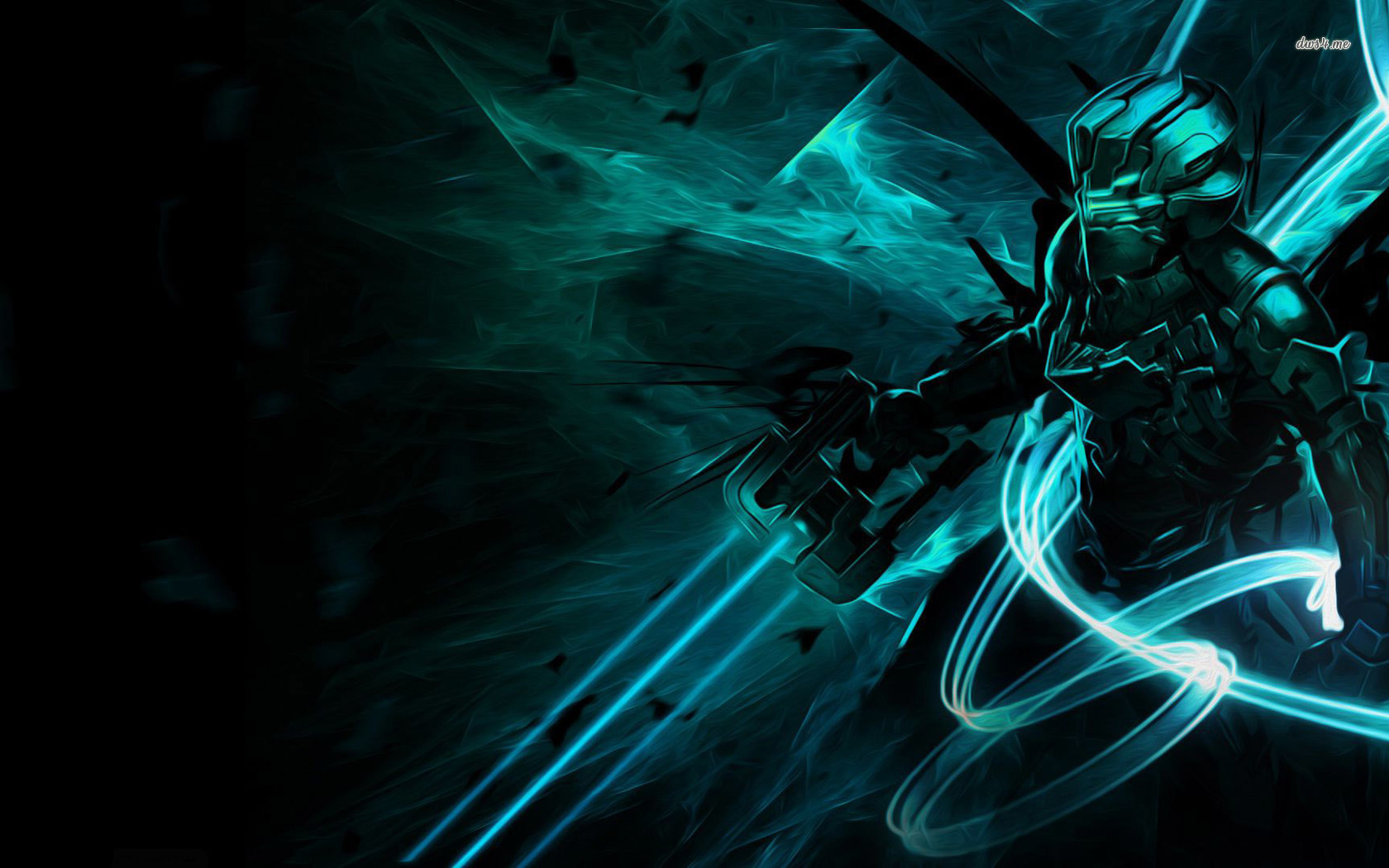 Description: A man with a sword in a dark background with blue lights and a black background with a green and blue design.