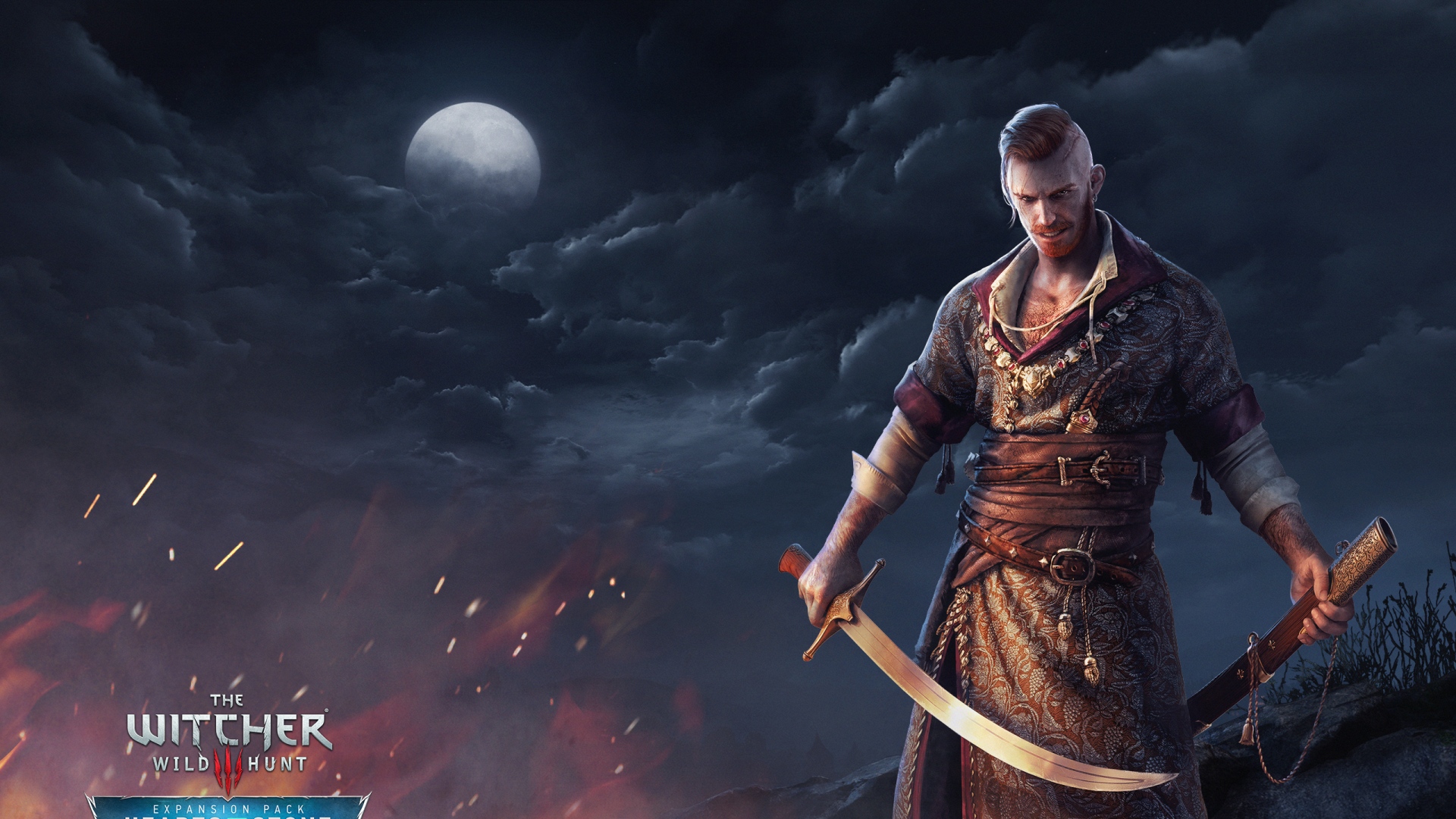 Description: A man holding a sword in front of a dark sky with a full moon in the background and a fire burning behind him.