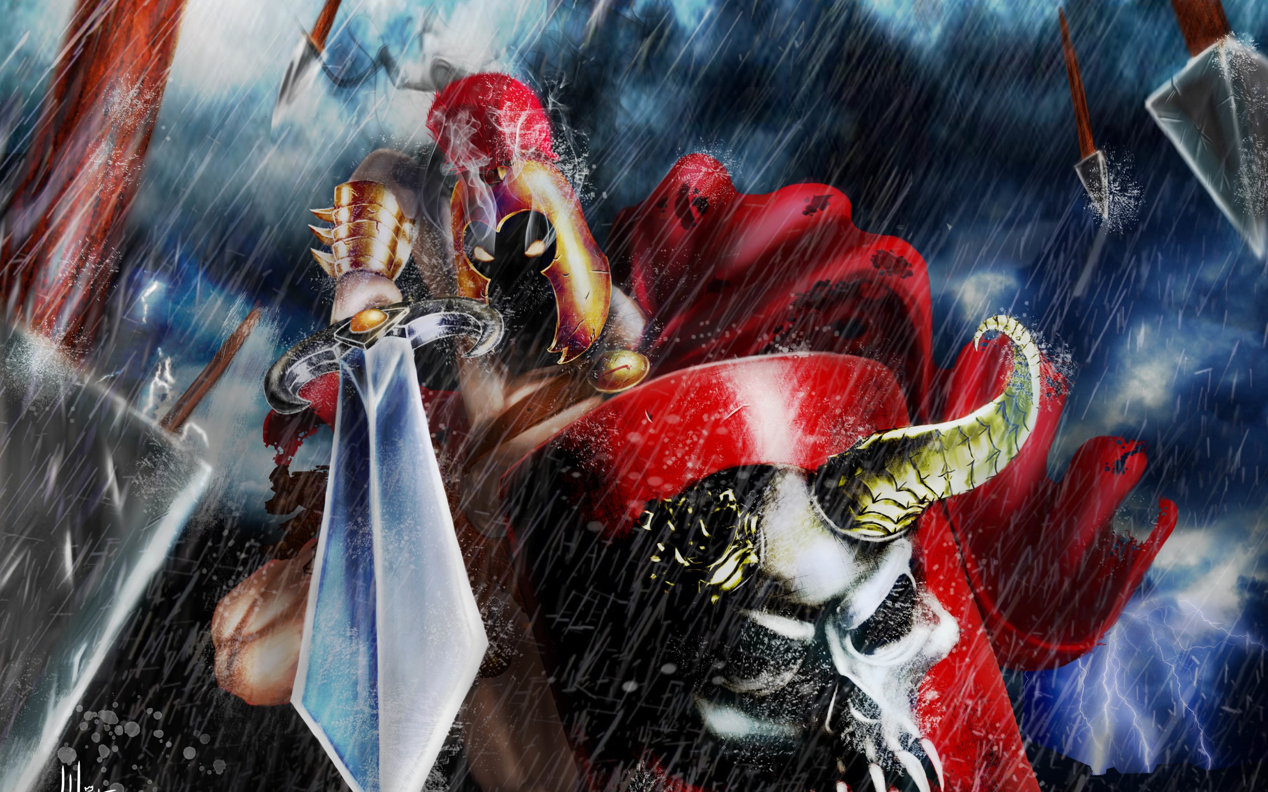 Description: A painting of a man holding a sword and a demon with horns and horns on his head.