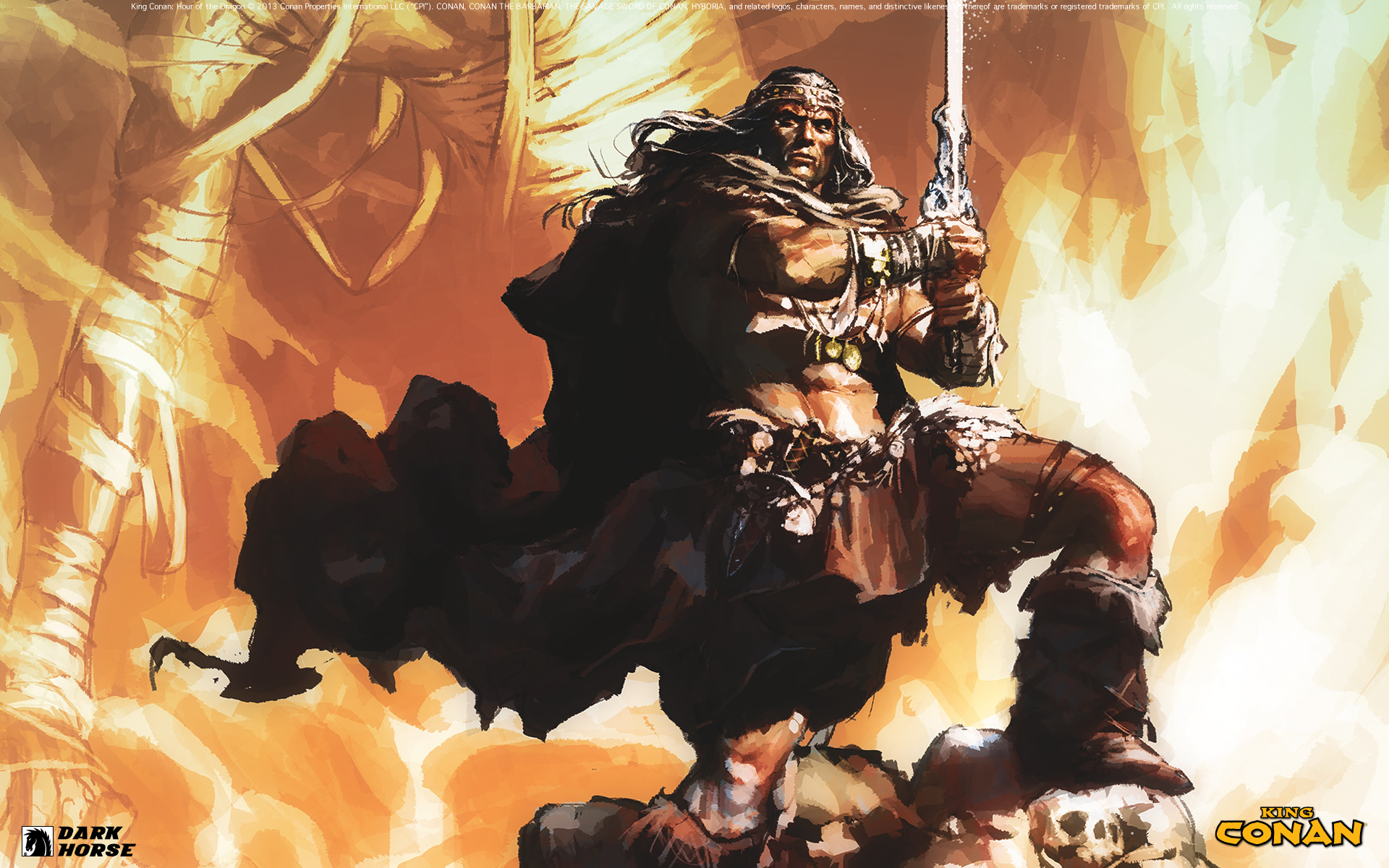 Description: A man with a sword standing in front of a fire background with a demon on it's back.