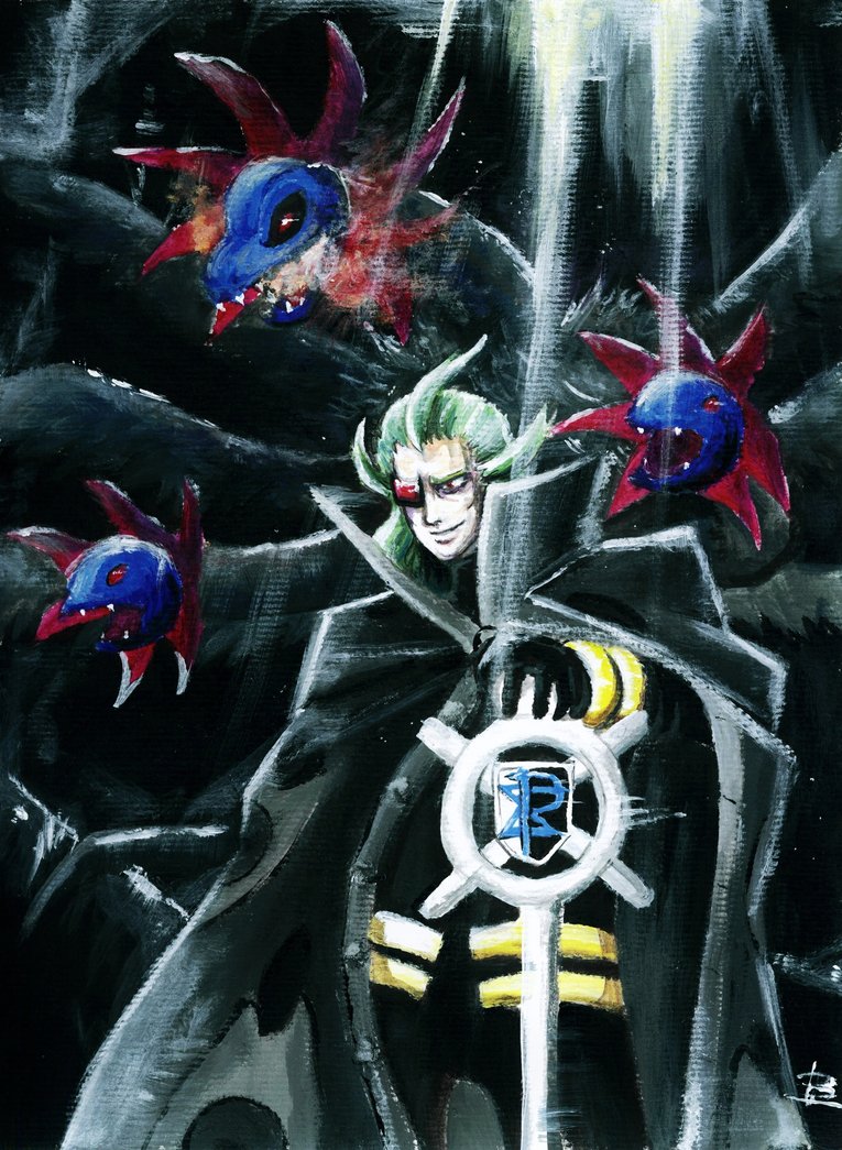 Description: A painting of a man with a sword and some fish around him and a sword in his hand and a sword in his other hand.