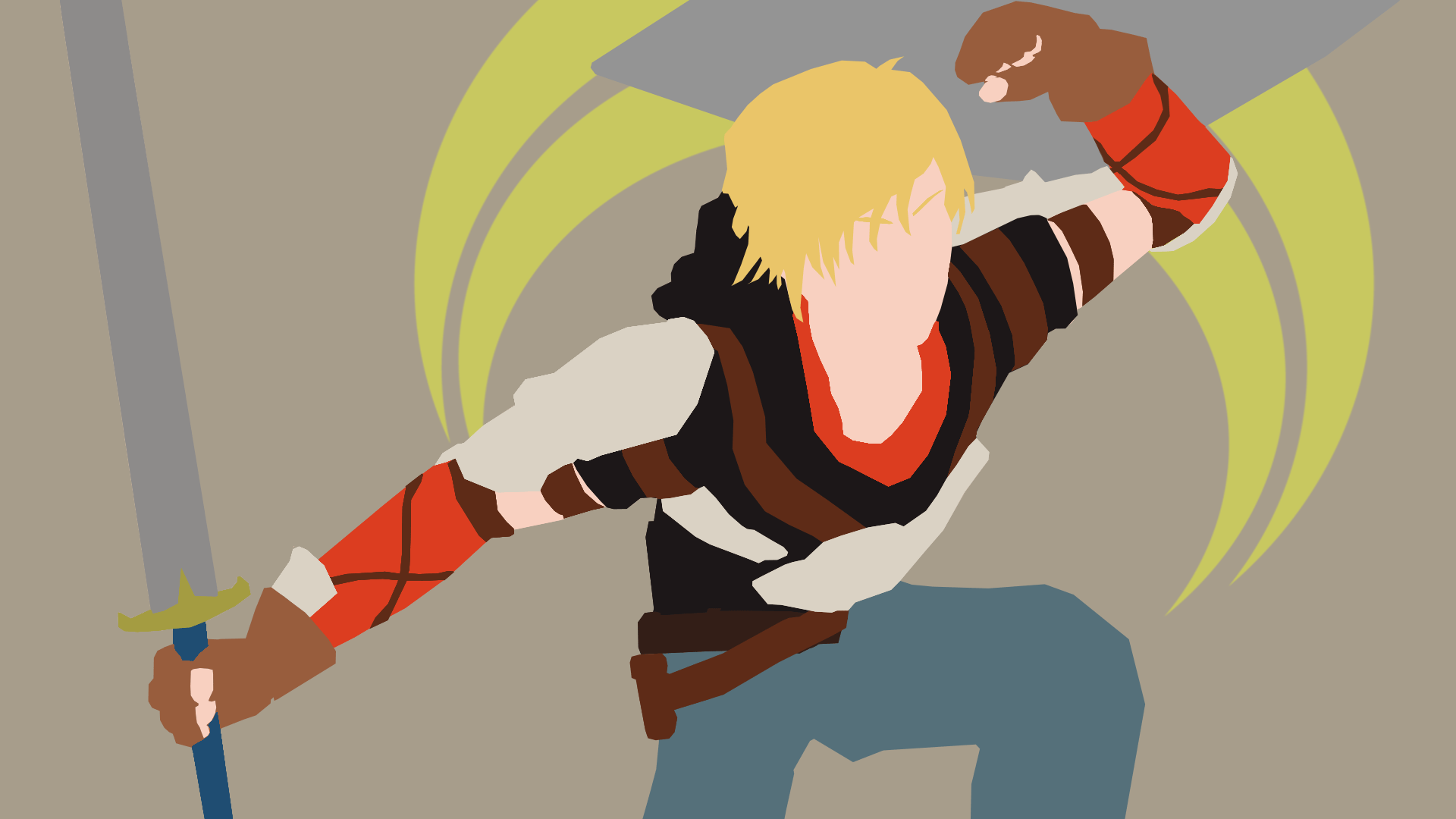 Description: A digital painting of a man holding a sword and a sword in his hand with a green arrow in the background.