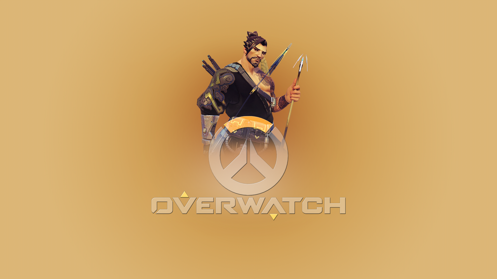 Description: A man with a sword and a hat on his head is standing in front of a brown background with the word overwatch.