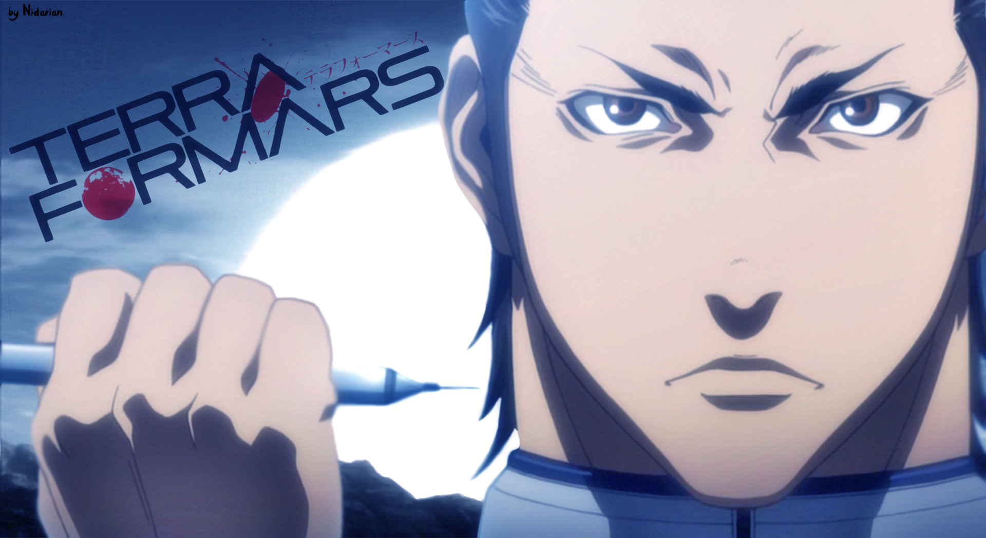 Description: A man with a sword in his hand and a moon in the background with the words terra formars on it.