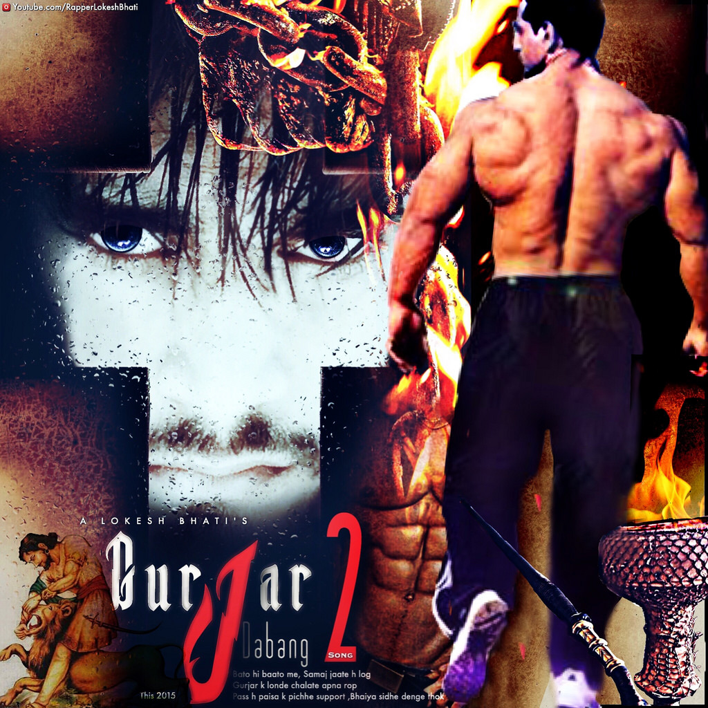 Description: A man with a sword standing in front of a poster of a man with a demon face on it.
