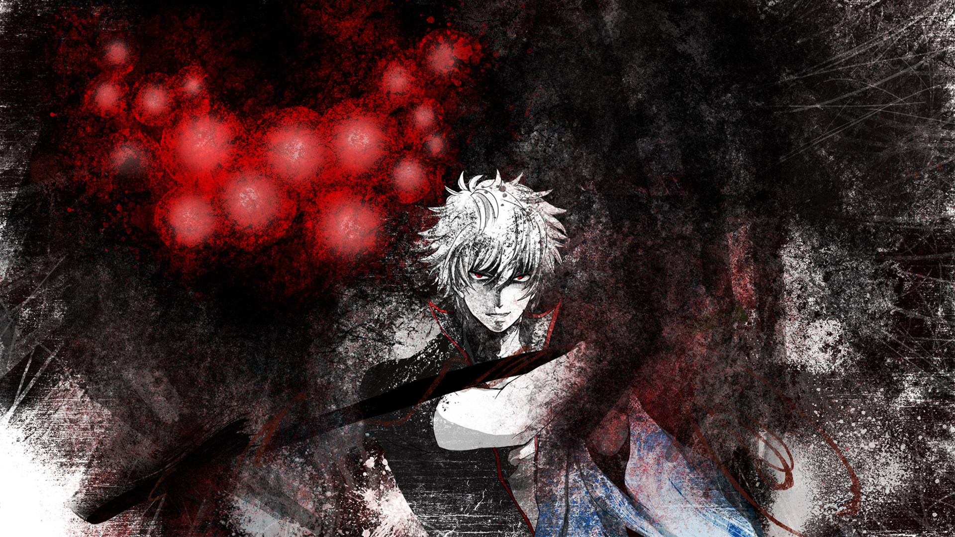 Description: A man with a sword standing in front of a red background with a black and white background and a red and white background.