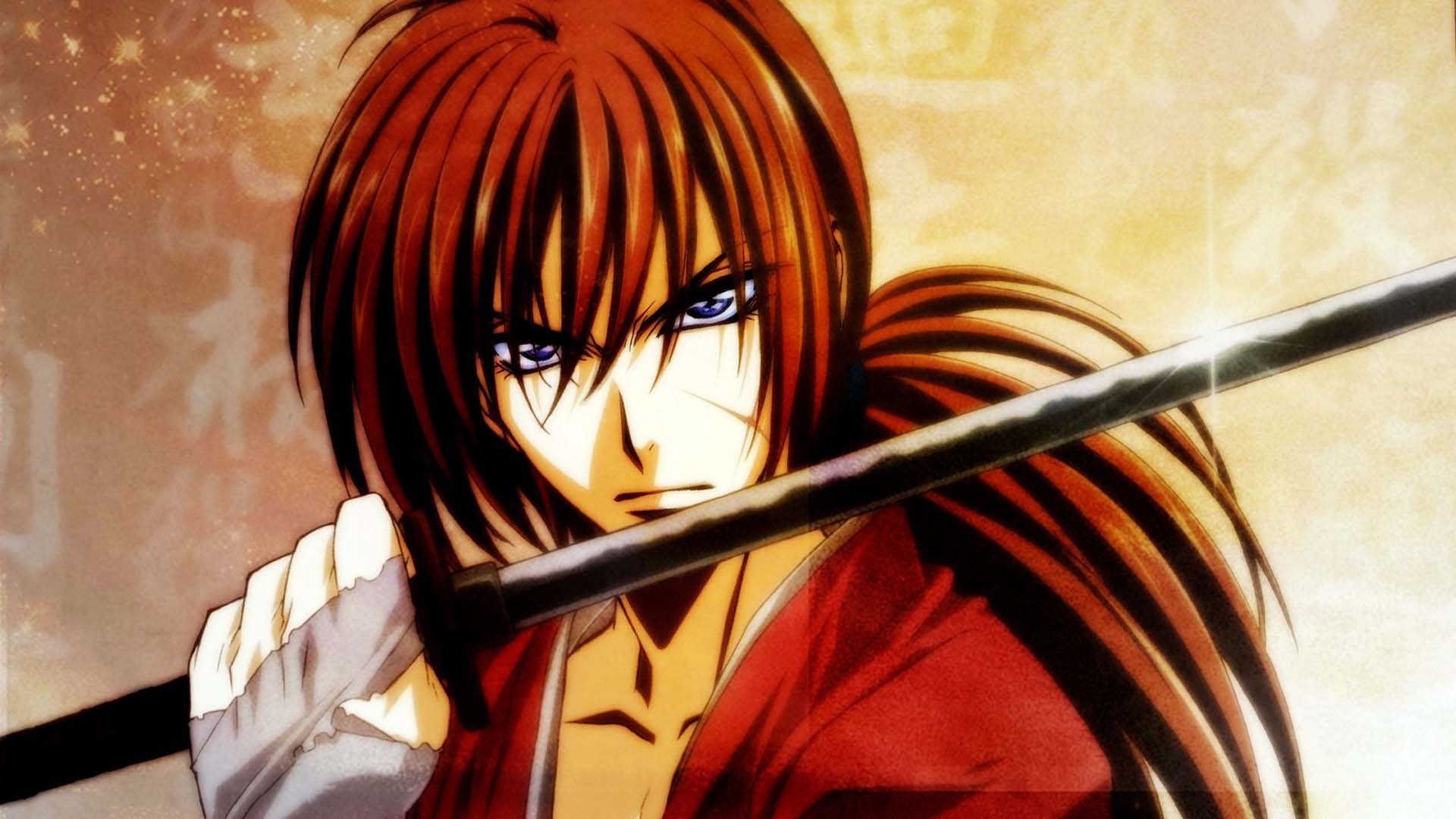 Description: A man with a sword in his hand and a red shirt on his shirt is staring at the camera.