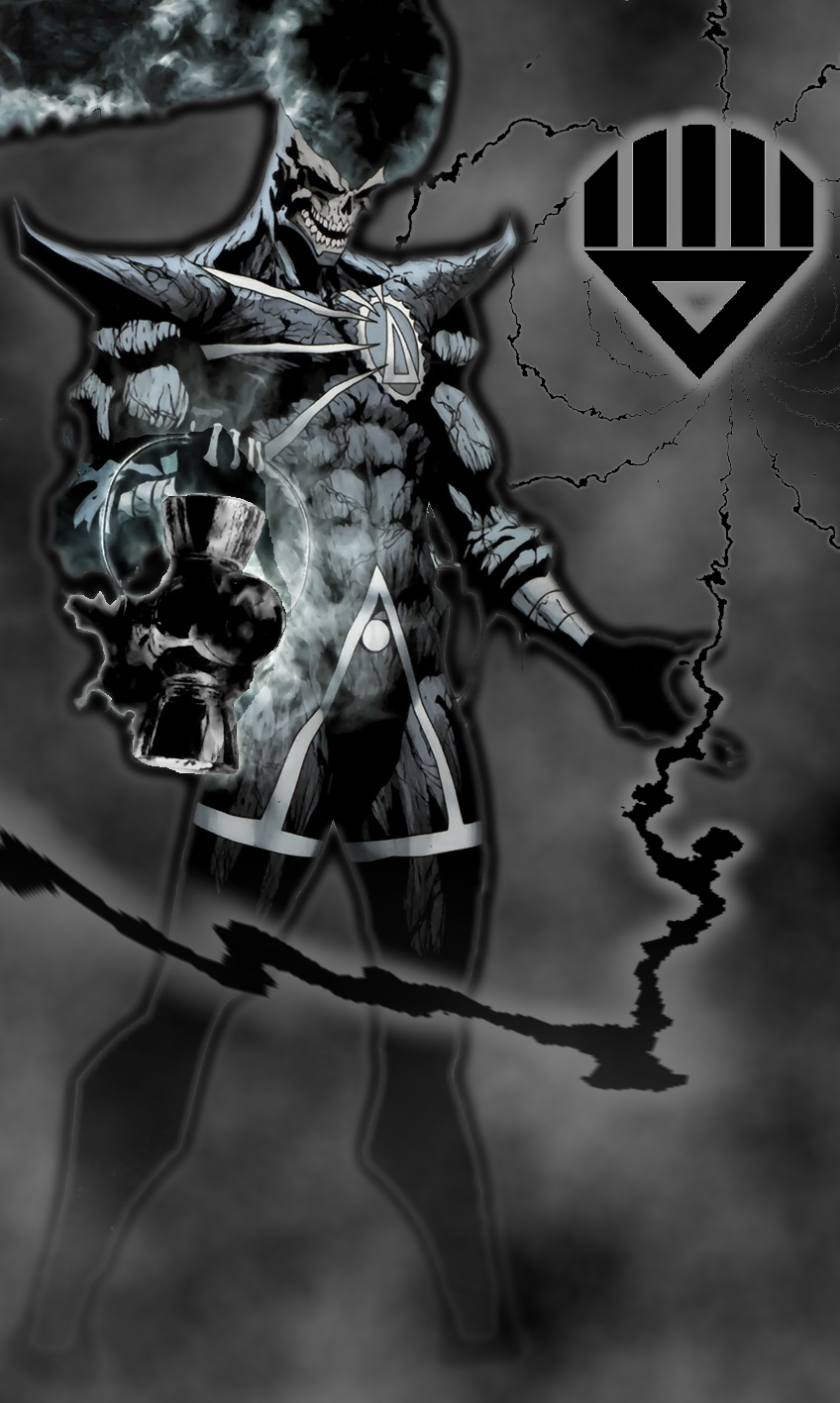 Description: A man with a sword and a skull on his arm and a black and white background with a black and white design.