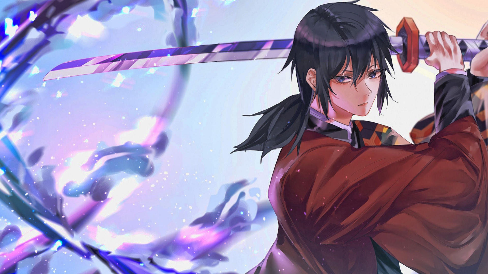 Description: A man holding a sword in his hand and a sky background with clouds and stars behind him.