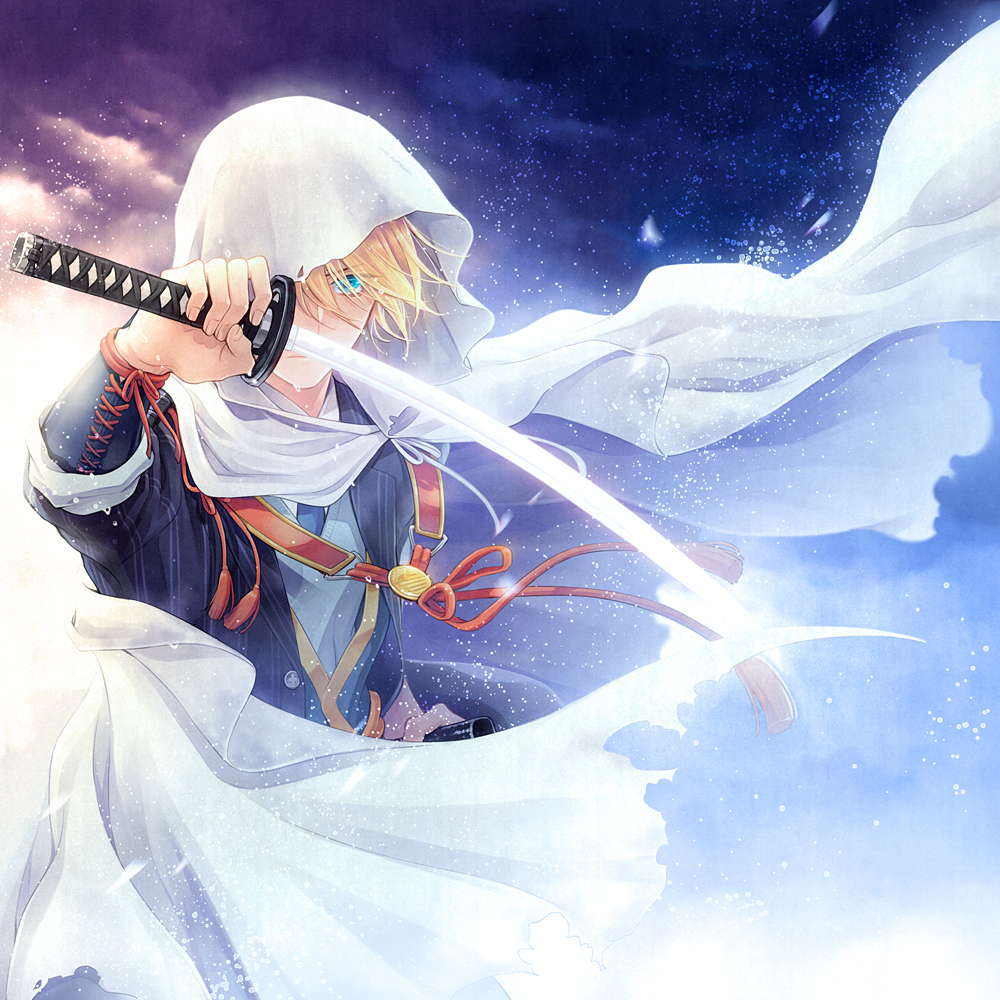 Description: A man with a sword in his hand and a white cloak around his neck.