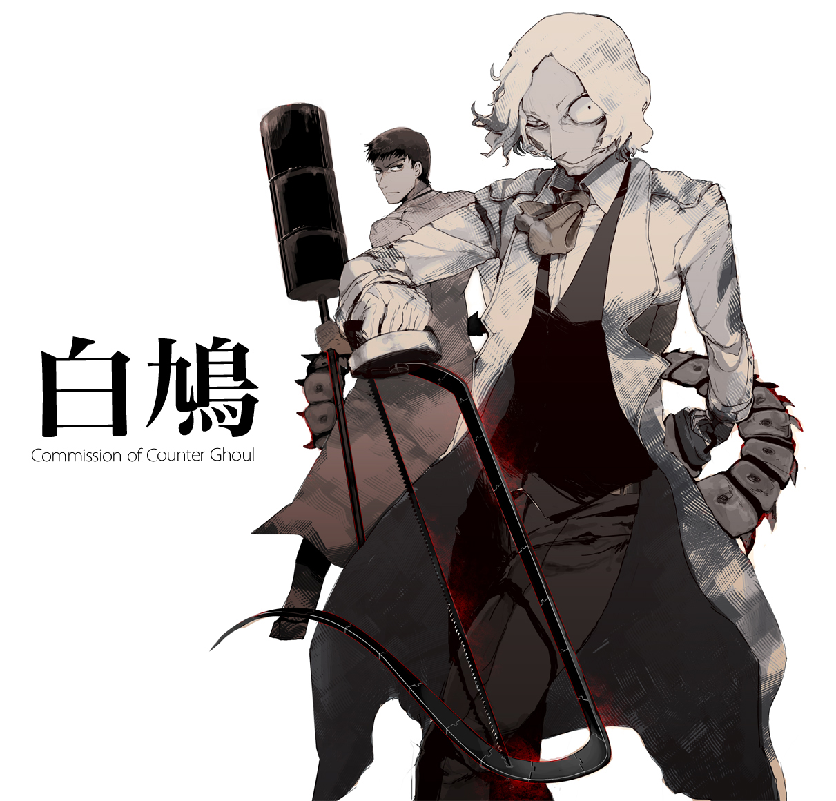 Description: A man with a sword and a woman with a suit on holding a sword and a cane in their hands.
