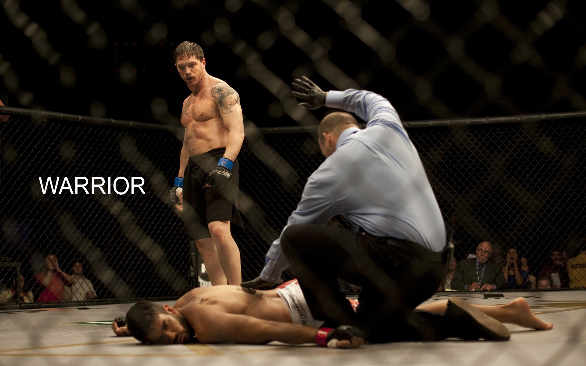 Description: A man is being taken down by a referee in a caged area with a man on the ground.