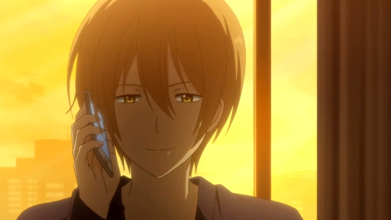 Description: A man talking on a cell phone in front of a window with a city skyline in the background at sunset.