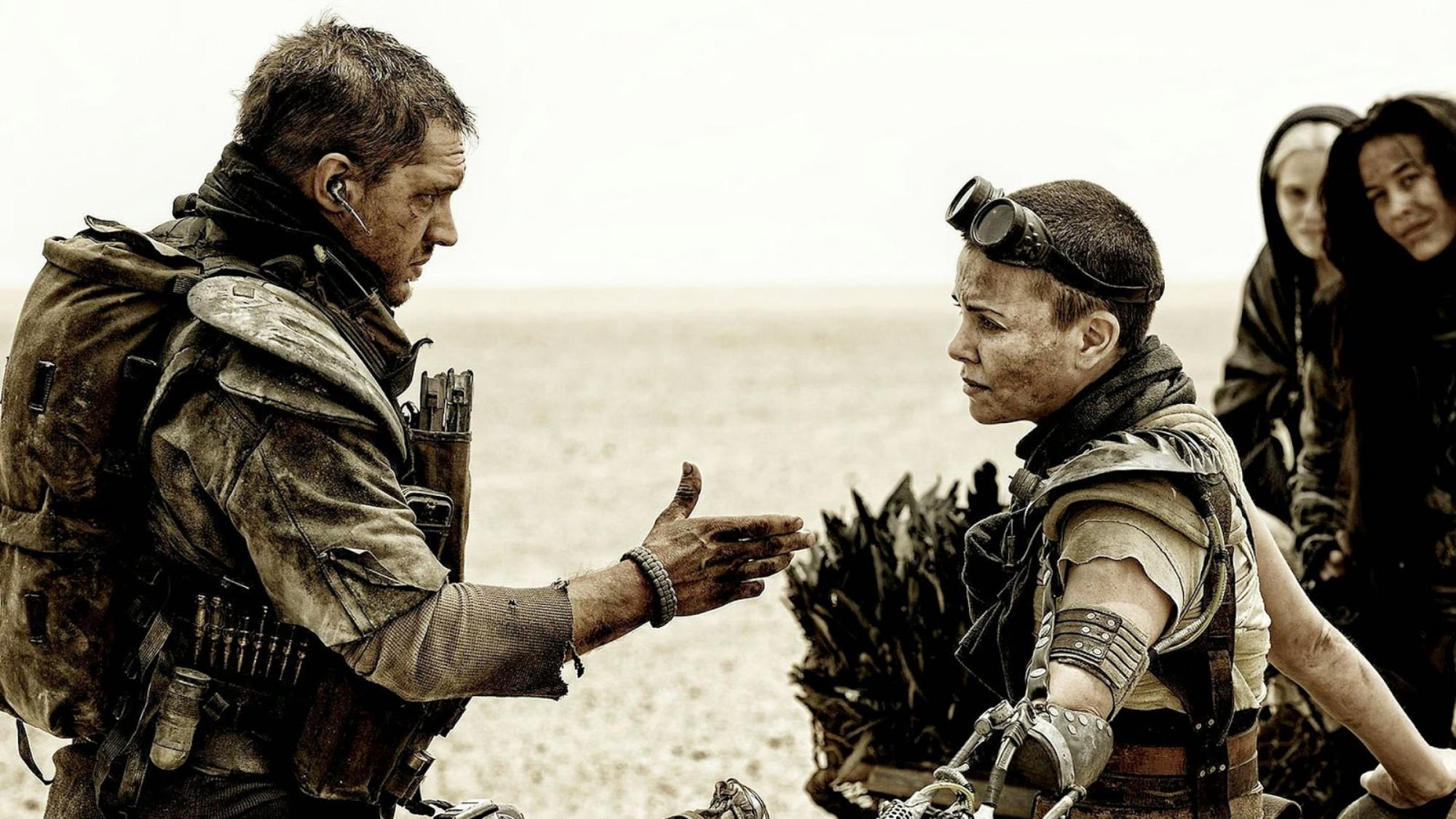 Description: A man talking to a woman on a motorcycle in the desert with other people standing around him and looking at him.