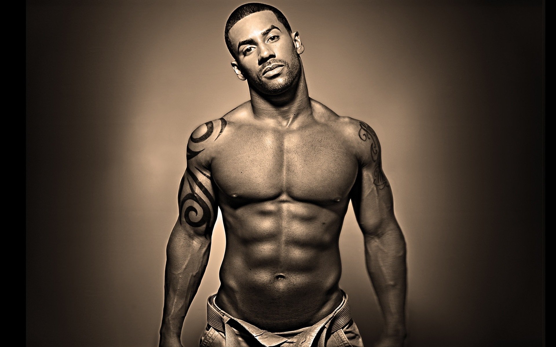 Description: A man with a tattoo on his arm and chest standing in a pose with his hands in his pockets.