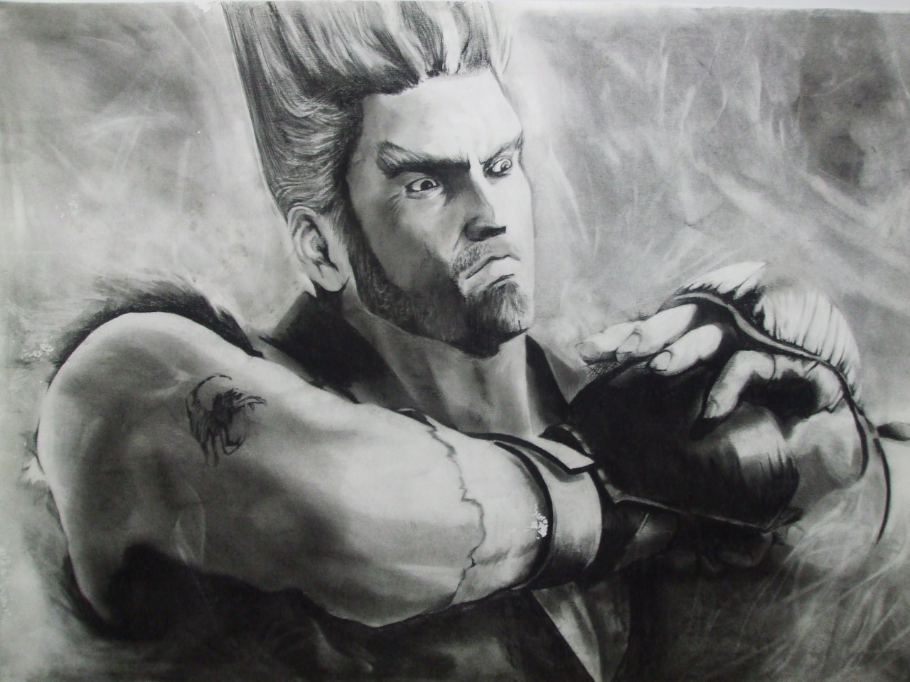 Description: A drawing of a man with a tattoo on his arm and a glove on his hand.