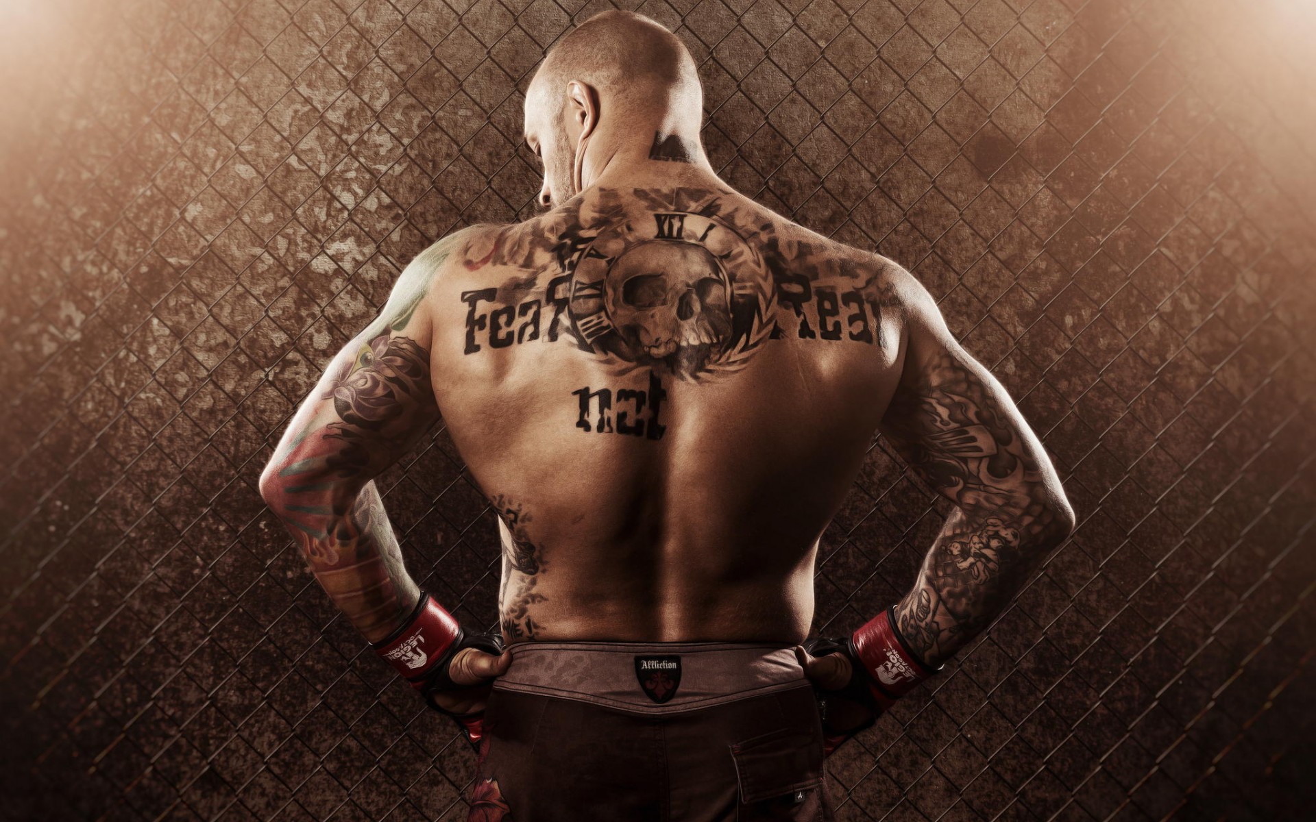 Description: A man with a tattoo on his back standing in front of a fence with his hands on his hips.