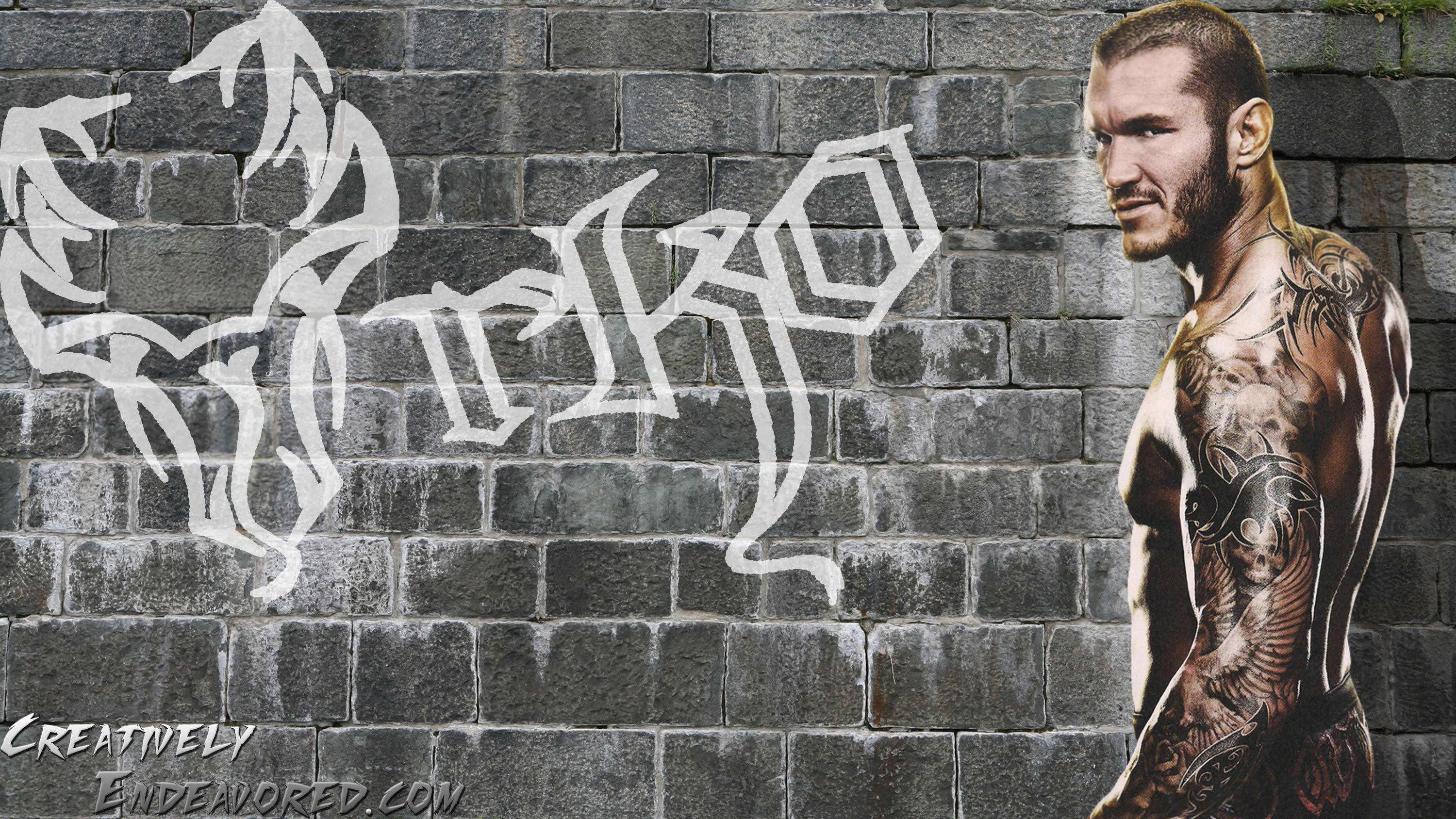 Description: A man with a tattoo standing in front of a brick wall with graffiti on it and a large sign that says.