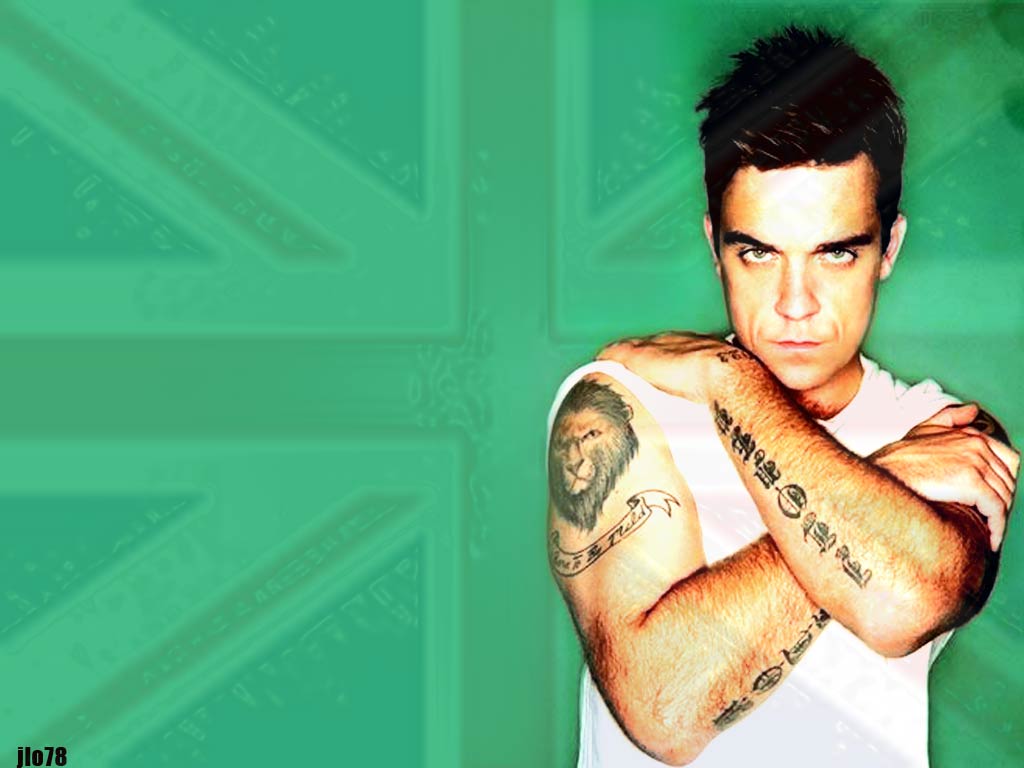 Description: A man with tattoos on his arms and chest standing in front of a green background with a flag of the united kingdom.