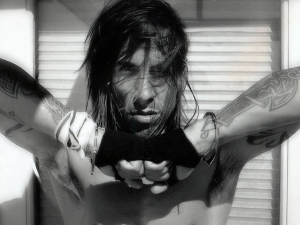 Description: A man with tattoos holding a gun in his hands and looking at the camera with a serious look on his face.