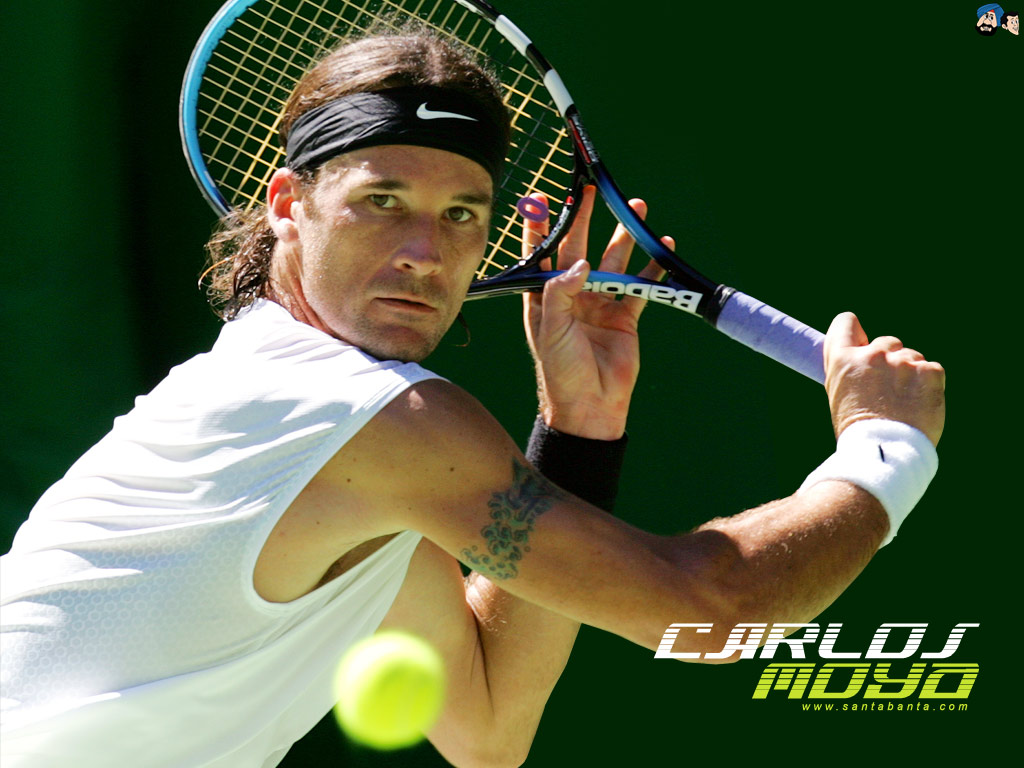 Description: A man holding a tennis racquet on a tennis court with a green background and a black and white logo.