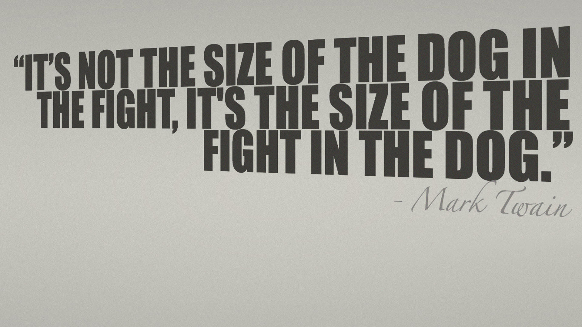 Description: A man is holding a tennis racket in his hand and a quote on the wall above him that says it's not the size of the dog in the fight.