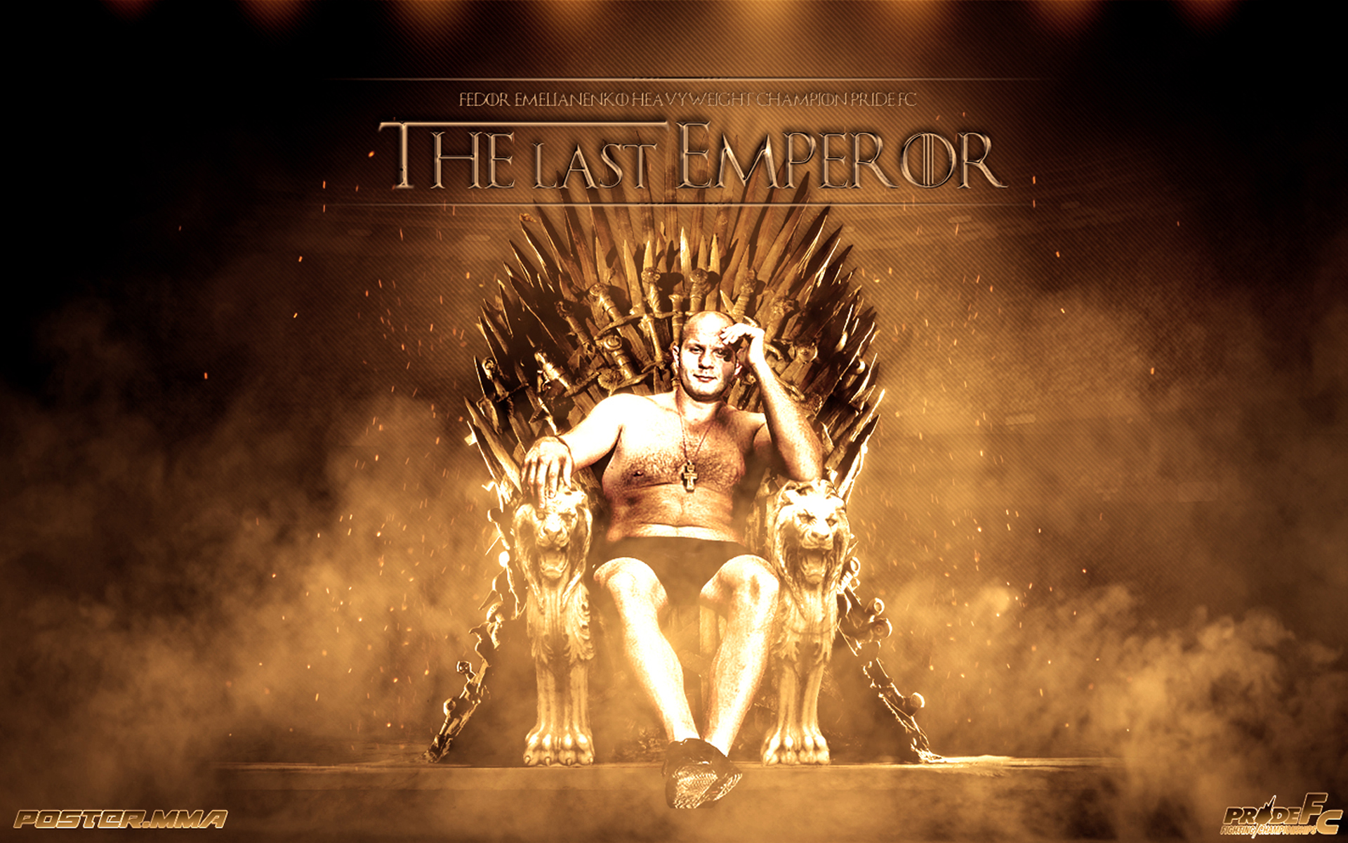 Description: A man sitting on a throne with a dog on it's lap in front of a poster of a game of throne.