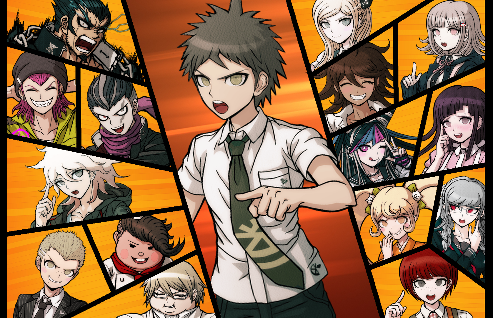 Description: A man in a tie and some anime characters in a collage of photos with orange background and orange background.