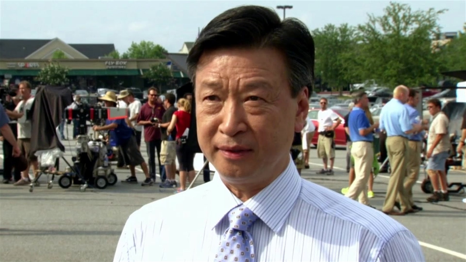 Description: A man in a tie and a crowd of people in the background are standing in a parking lot with cars.