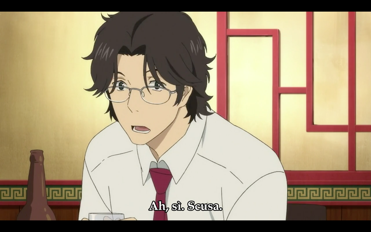 Description: A man in a tie and glasses sitting in front of a bottle of beer with a caption that reads.