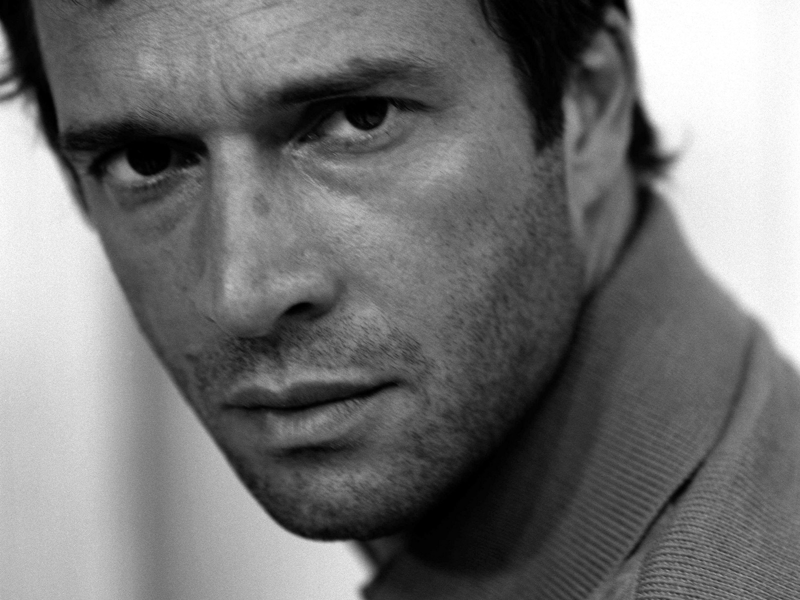 Description: A man with a tie on posing for a picture in a black and white photo with a white background.
