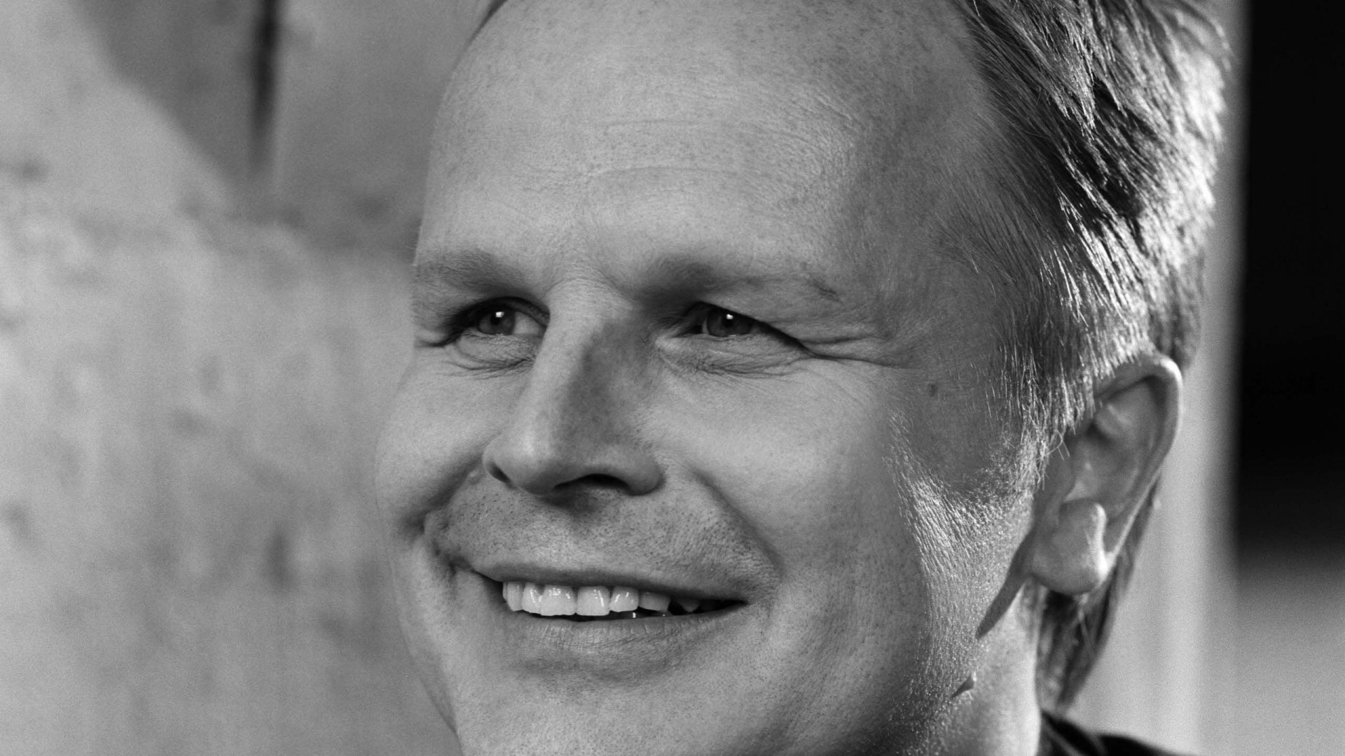Description: A man with a tie and a suit smiling for the camera with a wall behind him and a wall behind him.