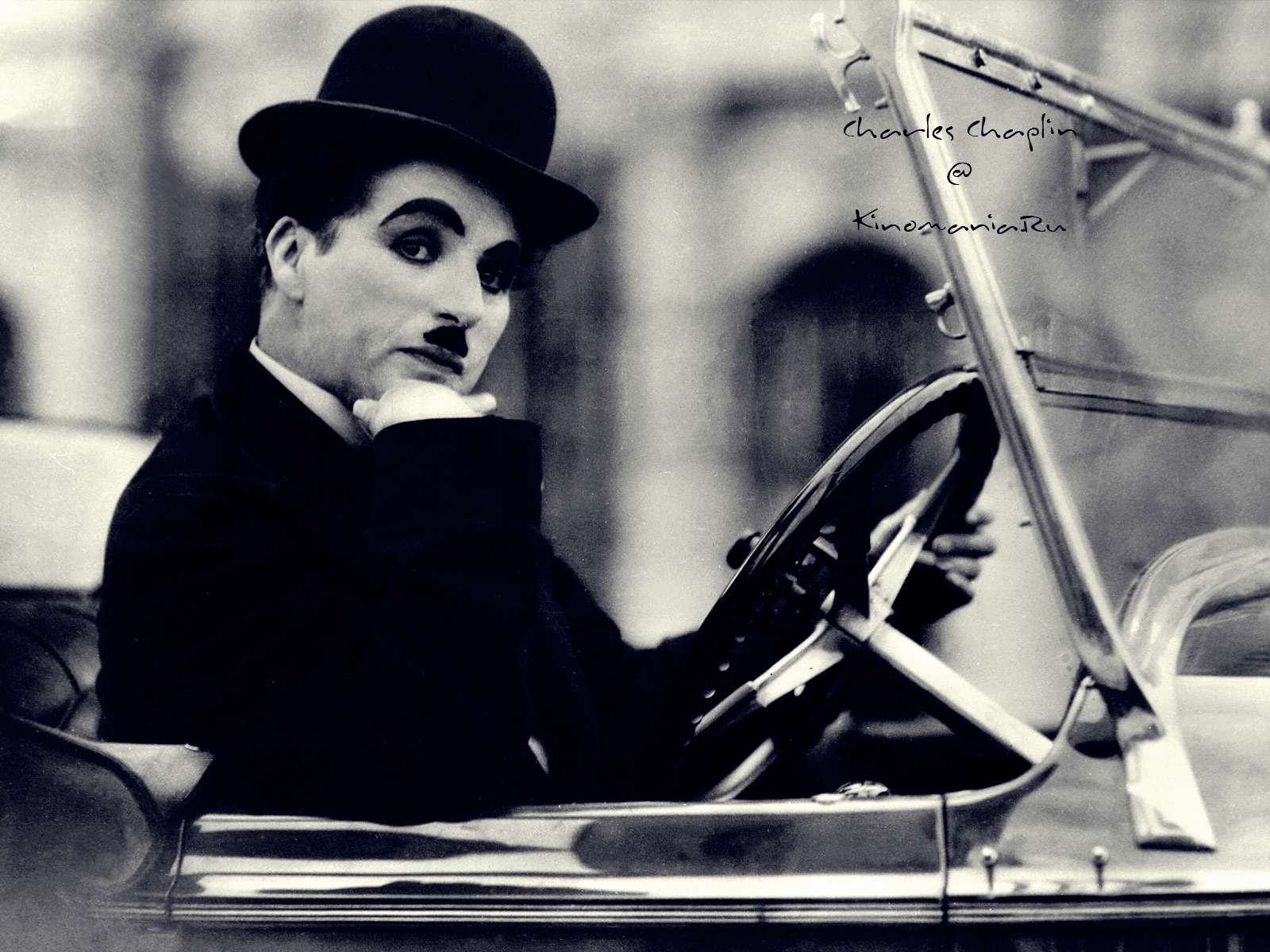 Description: A man in a top hat and coat driving a car with a cigarette in his mouth and a cigarette in his mouth.