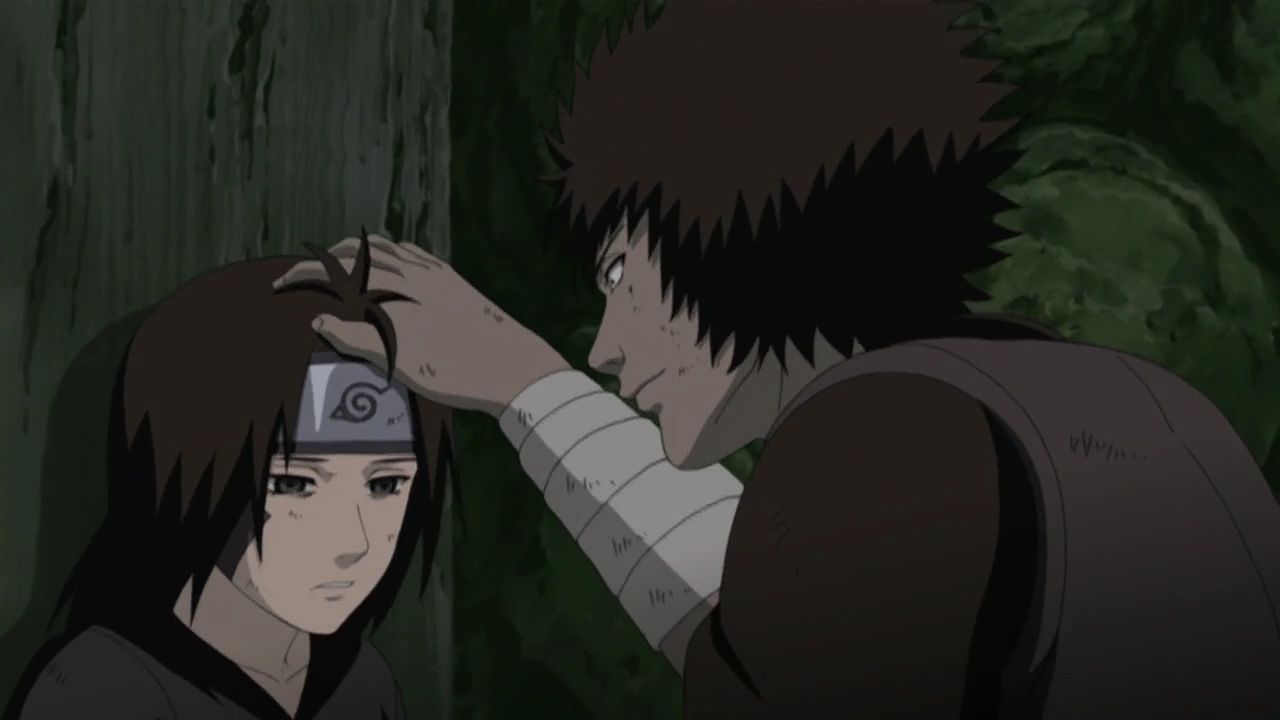 Description: A man is touching another man's head in a forest with trees in the background and a woman is holding her head.