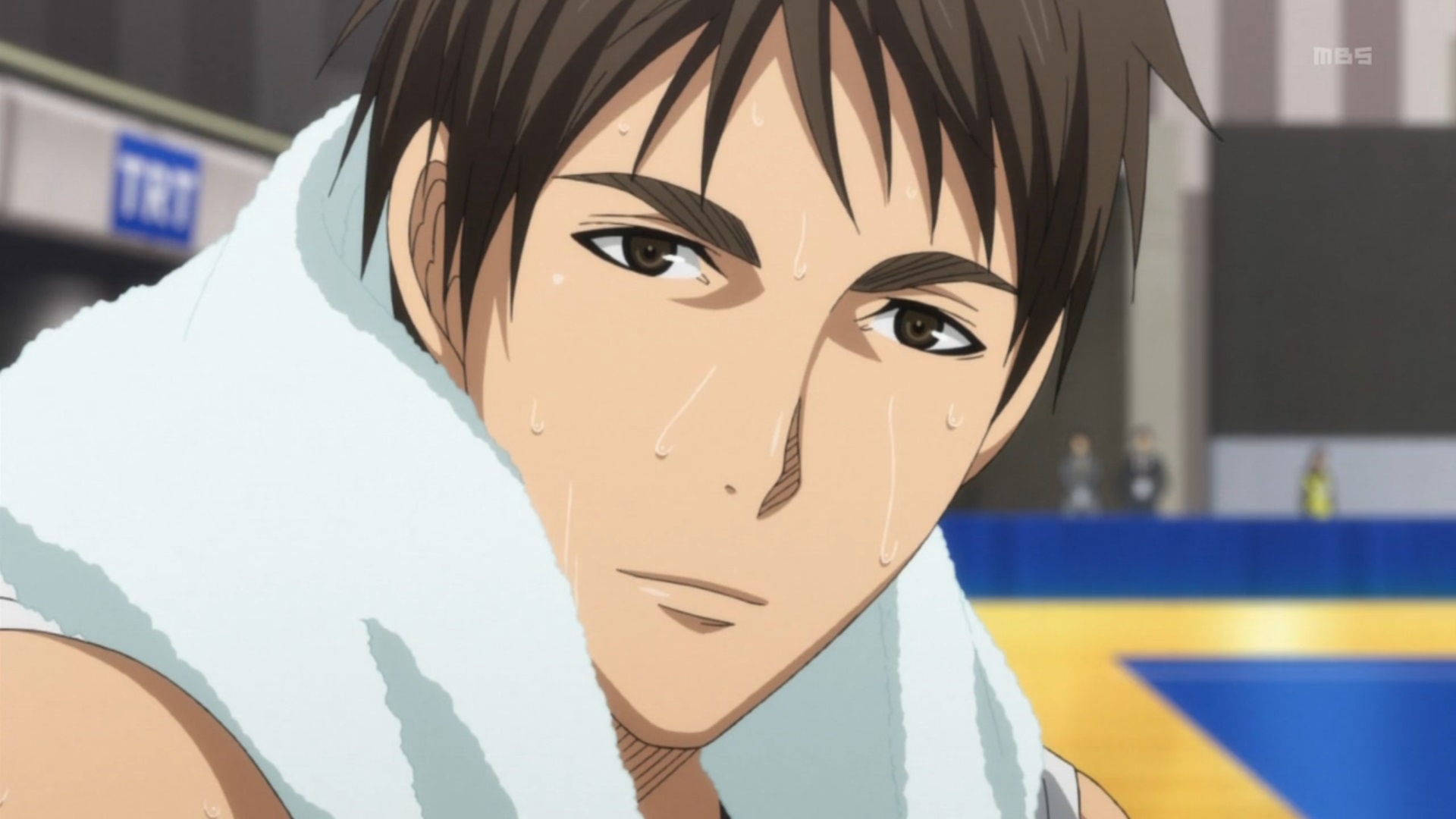 Description: A man with a towel on his head and a towel on his shoulder.