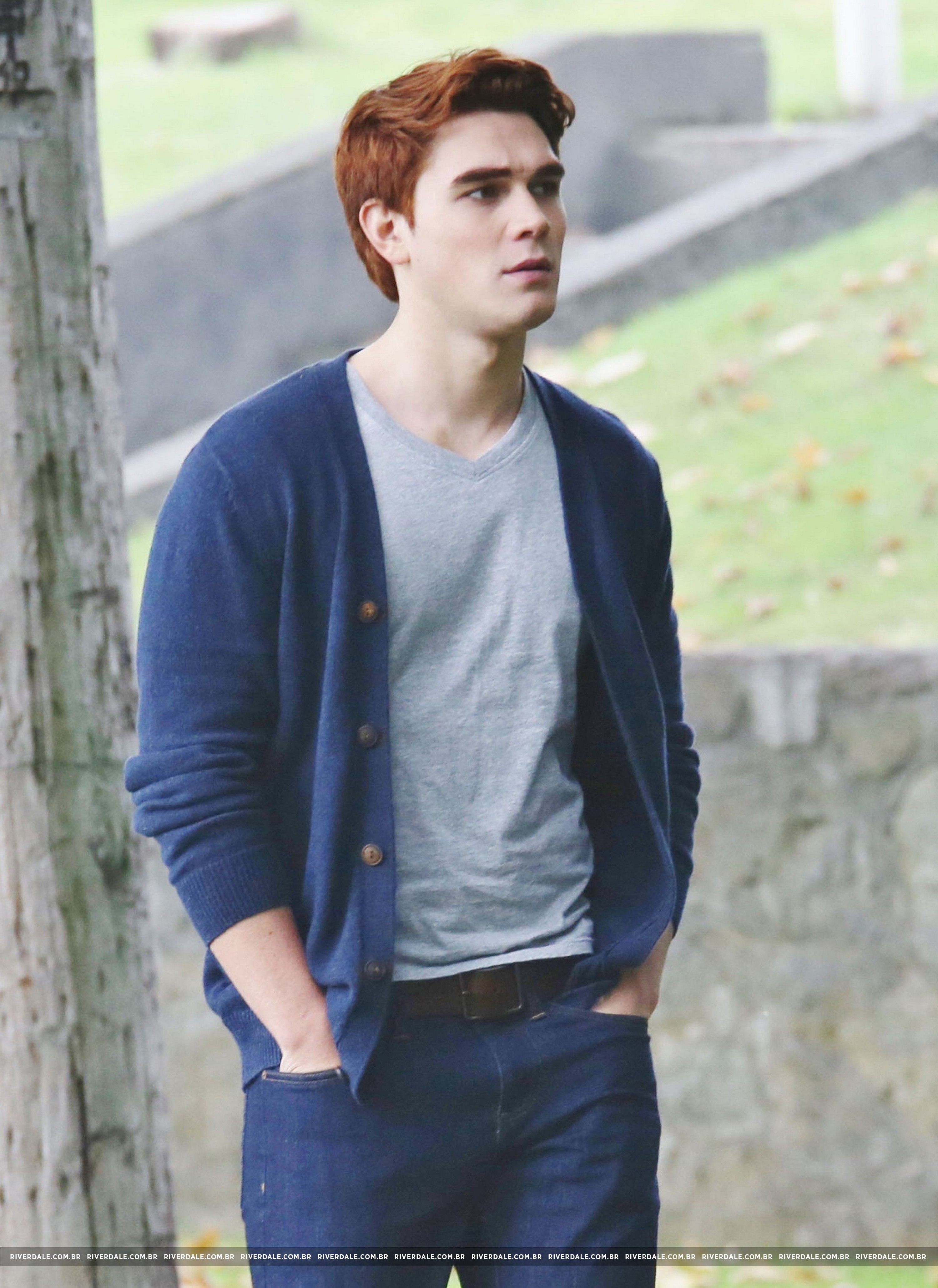 Description: A man standing next to a tree in a park with a green field behind him and a stone wall.