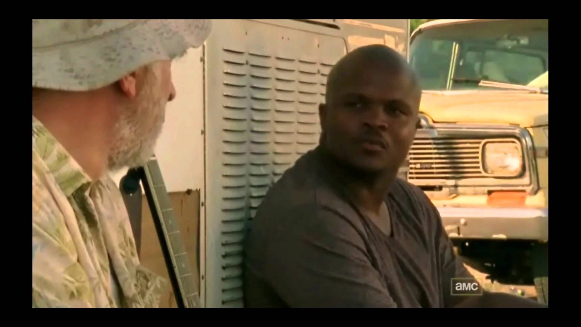 Description: A man standing next to another man in front of a truck and a truck trailer with a truck behind him.