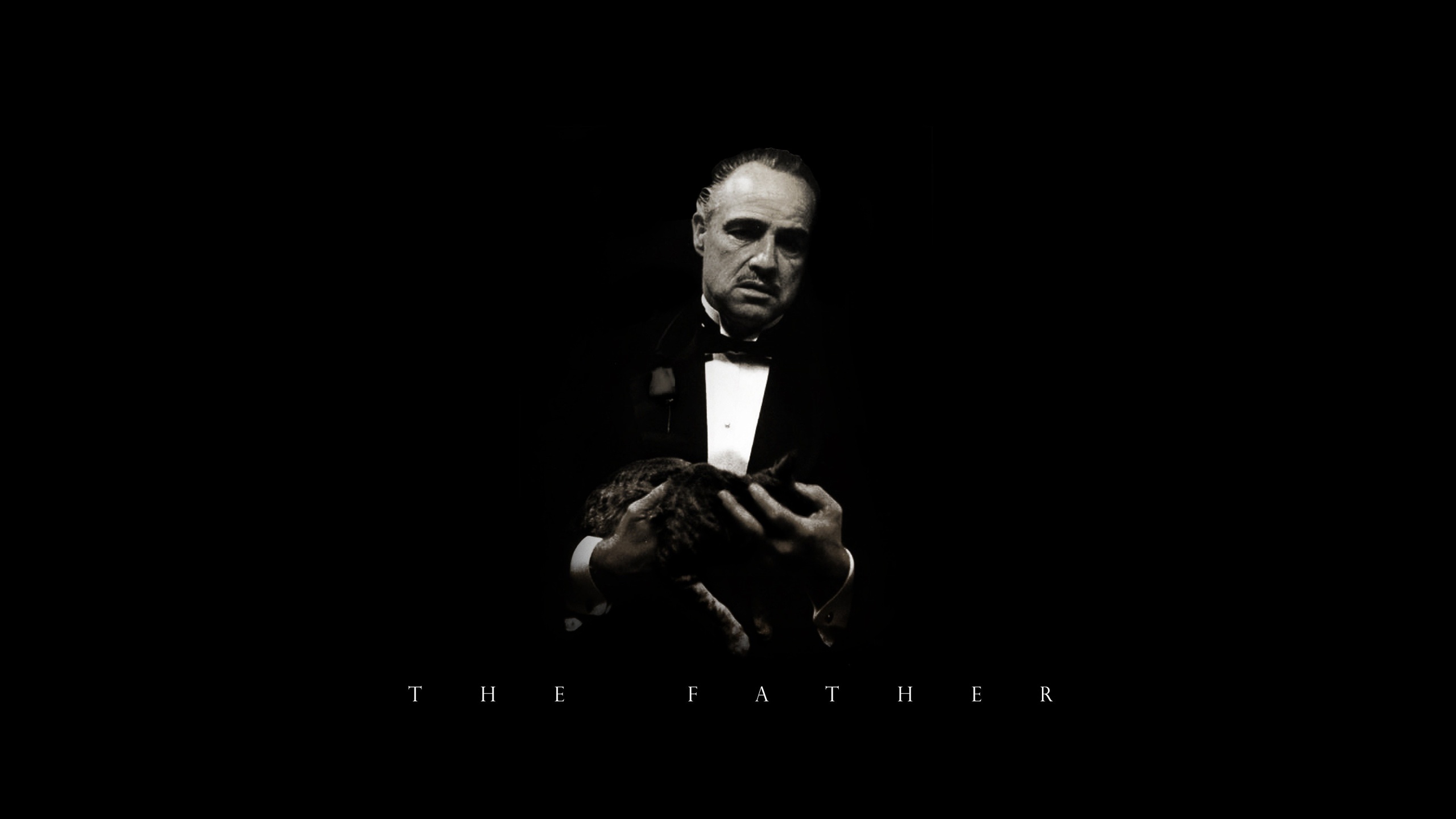 Description: A man in a tuxedo holding a cat in his hands in a dark room with the words the father written on it.