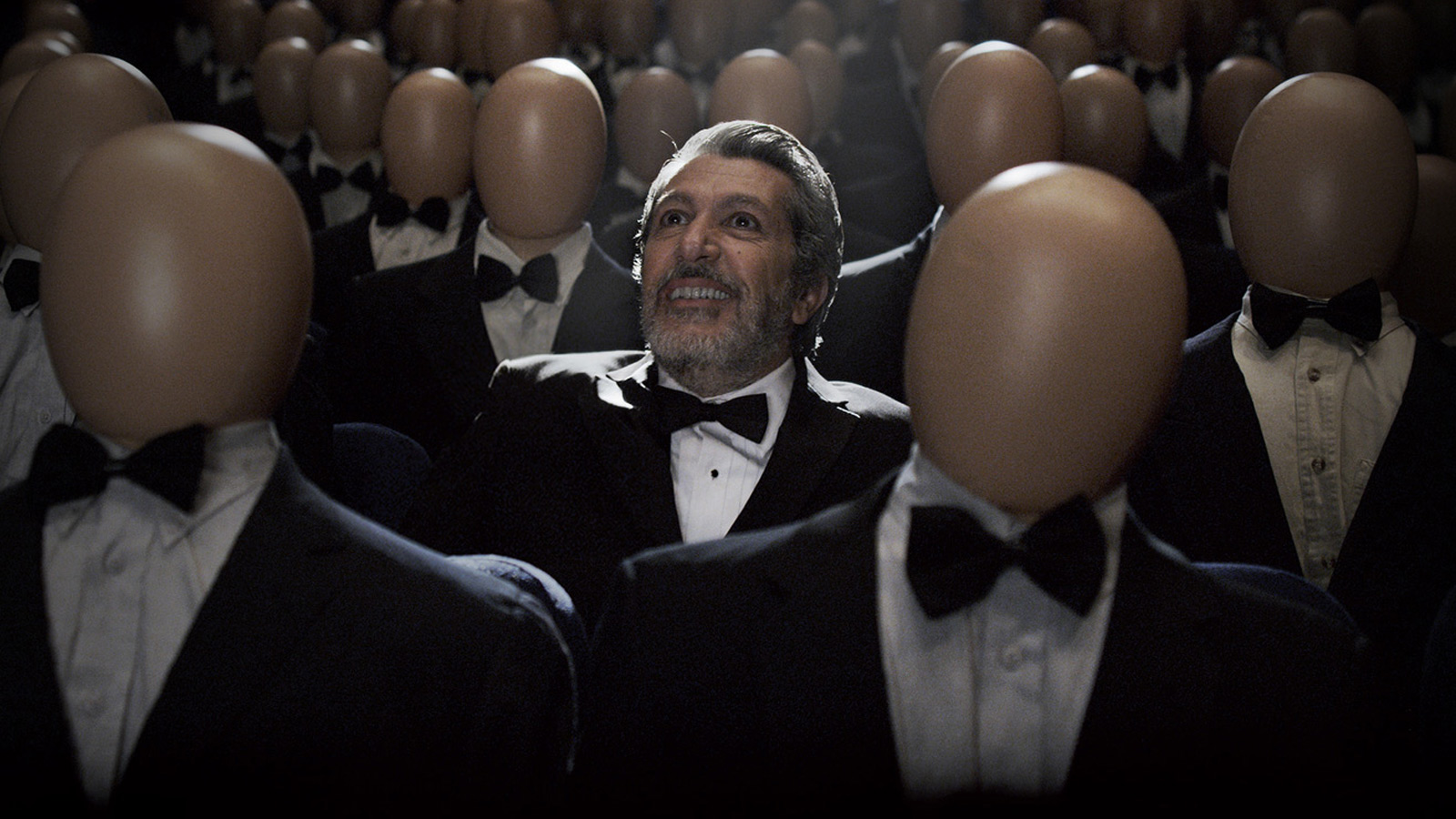 Description: A man in a tuxedo surrounded by mannequins with their heads in the air and their arms out.